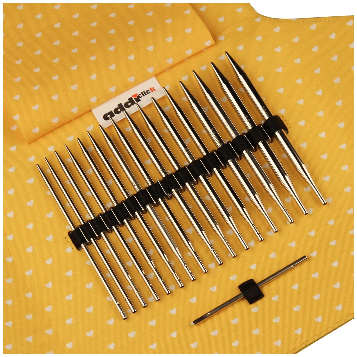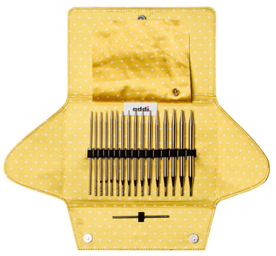 Набор круговых никелированных спиц со сменными лесками addiClick MIX Это настоящий вязальный эксклюзив. Известная на весь мир и единственная в своем роде запатентованная система смены спиц, которая во много превосходит спицы конкурентов. addiСlick не надо ввинчивать, не надо ключика. Они просто и удобно защелкиваются не оставляя абсолютно никакого зазора между спицей и леской. Спица никелированная и поэтому очень гладкая. 80% людей вяжут правой рукой туже, чем левой, а система addiClick исправляет это при работе с двумя различными толщинами спиц. Результат: улучшенная структура полотна. С этим набором возможны более 500 комбинаций, так как в него входят 8 пар спиц и 3 вида лески популярной длинны. Удобный: "Раскладной органайзер" идеален для перевозки и удобства использования. Набор имеет преимущество цены: покупка набора сразу дает возможность получить много комбинаций. Новый идея Mix была разработана совместно с известной вязальщицей Сильвией Раш. На пару спиц одинаковой толщины в этом наборе представлены кончики разной длинной LACE и BASIC, что позволяет идеально вязать изнаночные петли и вообще стирает границы в вязании. Новый чехол креативного желтого цвета особенно подчеркивает все разнообразие работ, которые можно сделать с помощью комбинаций этого набора.