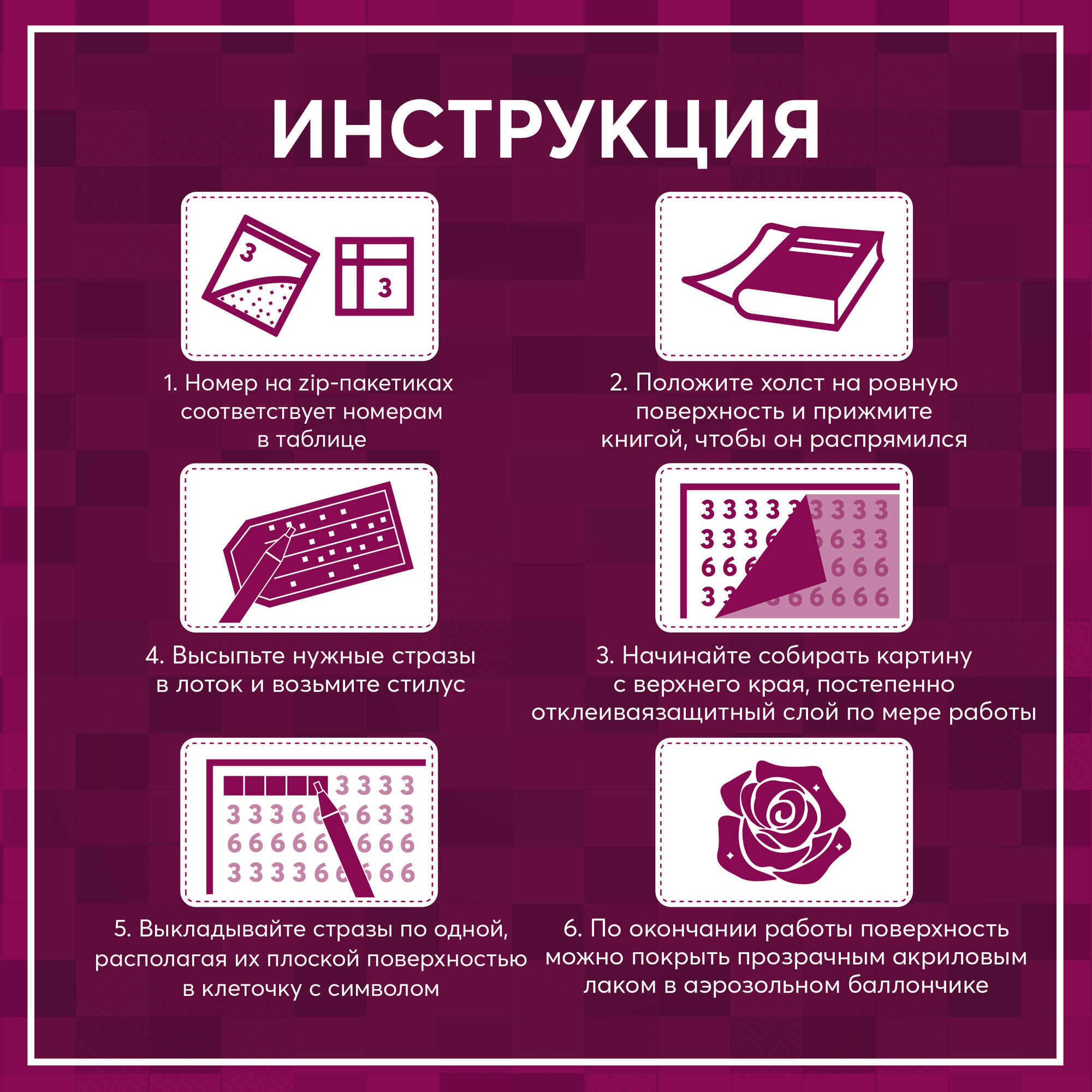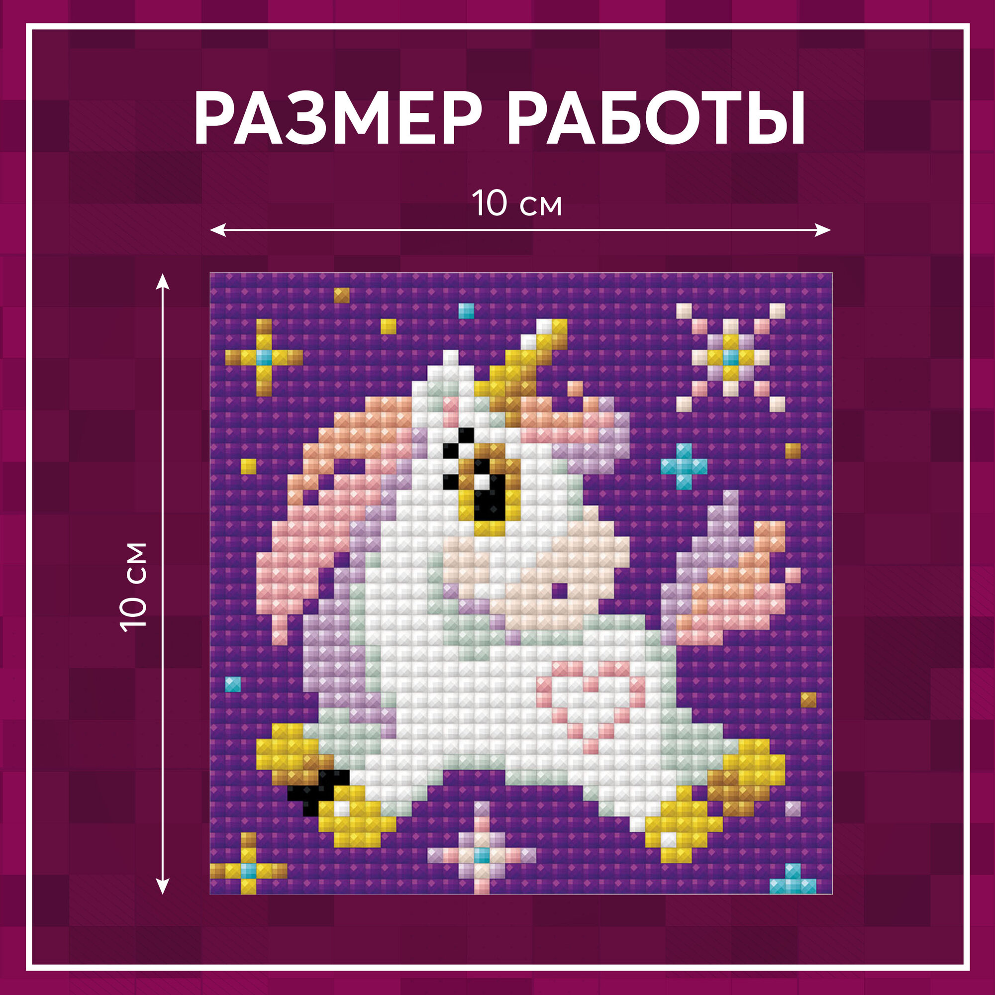 | Комплектация | Холст с клеевой основой и цветосимвольной схемой, два лотка, пинцет в мягком чехле, стилус, воск, маркированные пакетики со стразами. |