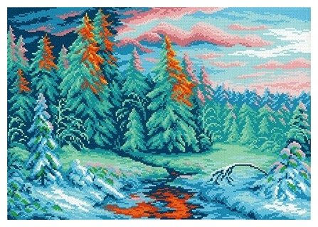 Зимний закат Рисунок на канве 40х50см 28х40(40х50) МП-Студия СК-021 28х40(40х50) МП-Студия СК-021 Состав: Канва Аида 14 с нанесенным рисунком-схемой, количество цветов мулине — 15 (нитки приобретаются отдельно!), частичная зашивка.