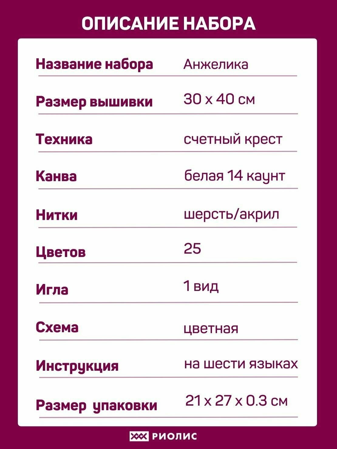 Вышивание - популярное и увлекательное хобби, которое дарит радость и умиротворение. Набор для вышивания - самый удобный вариант вышивок, как для начинающих, так и для опытных мастеров. Ведь набор содержит все необходимые материалы для создания настоящего шедевра. Отличный результат гарантирован! Вышивке всегда можно найти практическое применение. А вышитая собственноручно готовая картина станет отличным подарком близкому человеку. Она будет радовать долгие годы, даря любовь и тепло. Набор для вышивания "RIOLIS" "Сотвори Сама" 1817 "Анжелика" 30 х 40 см. Заполнение: Частичное. Количество цветов: 25. Схема: Цветная. Тема: Жанровые сценки. Техника исполнения: Бэкстич, Счетный крест. Тип канвы/ткани: Zweigart. Цвет канвы/ткани: белый. Размер готовой работы: 30 x 40 см.