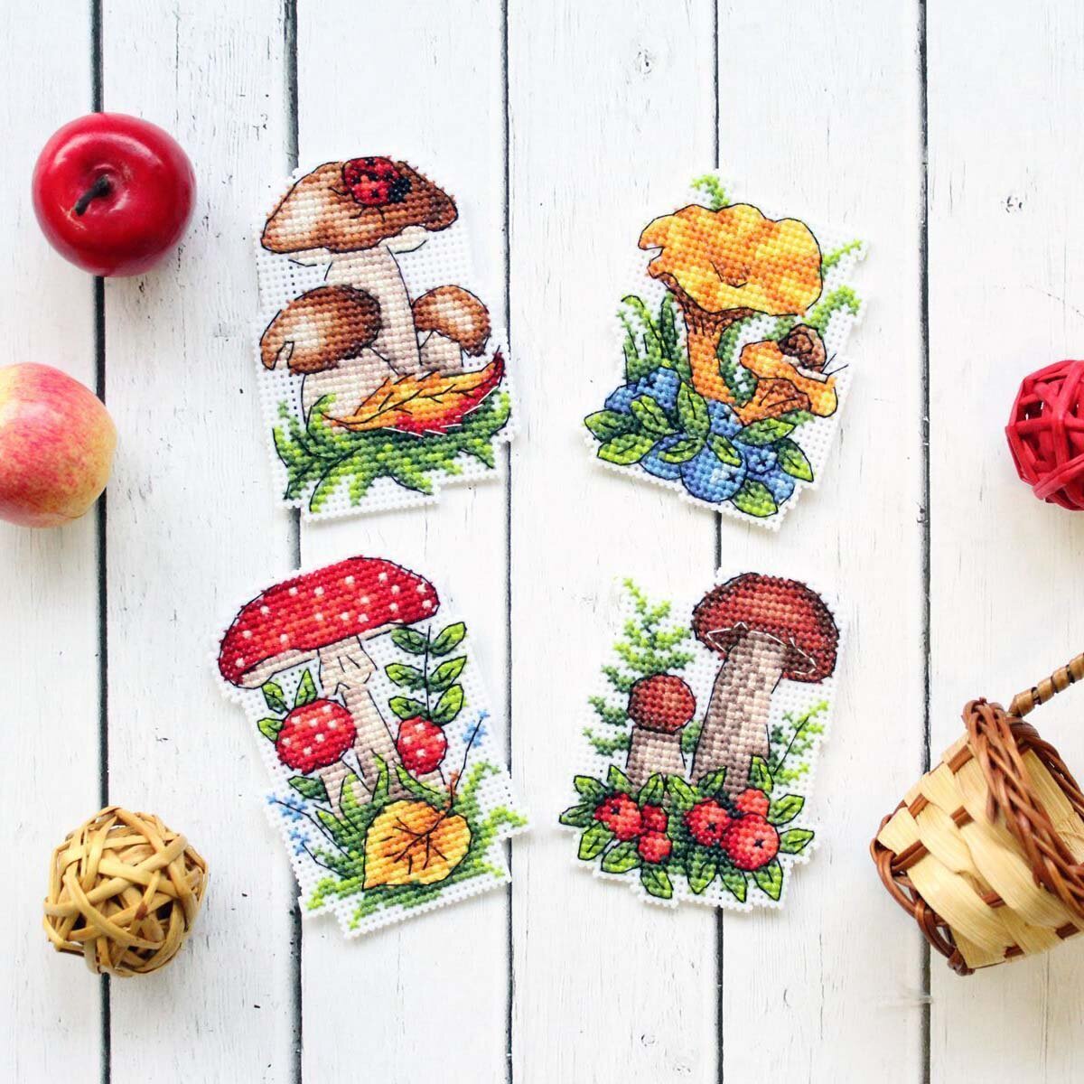 Вышитые магниты 'Грибное лукошко' на холодильник – это яркие оригинальные сувениры и превосходный подарок. Чтобы сделать такой сувенир, достаточно владеть техникой 'крест'. Пяльцы или рамки не понадобятся – пластиковая канва отлично держит форму. Готовые элементы надо вырезать по контуру. К оборотной стороне фиксируется фетр, который маскирует изнанку, и затем фиксируется магнитное полотно.