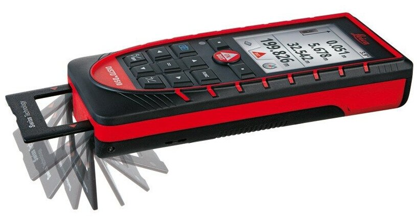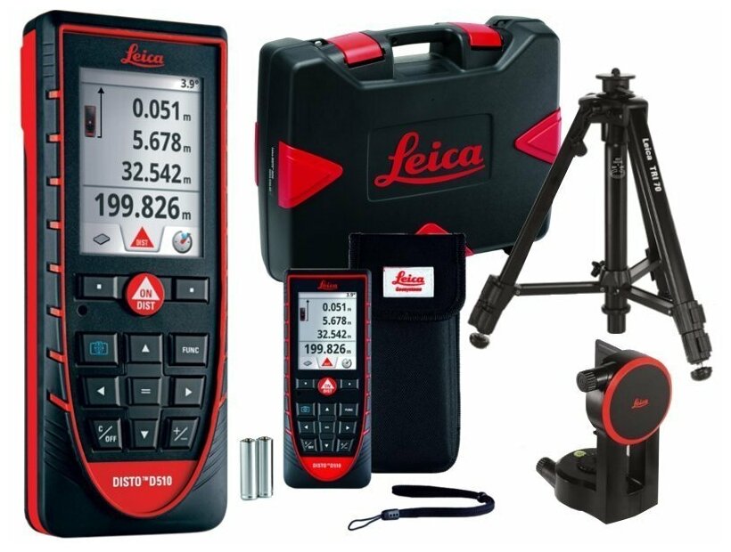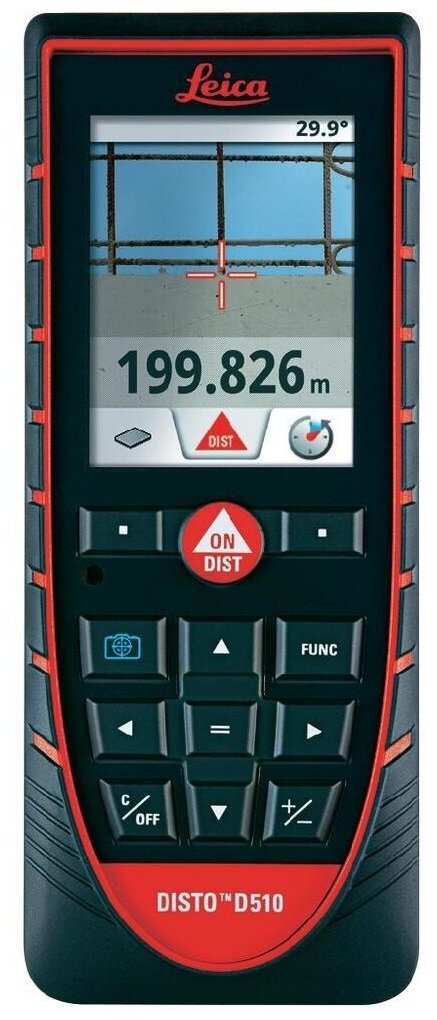 LEICA Disto D510 – профессиональный лазерный дальномер, объединяющий в себе цифровой визир и датчик наклона. Обладает широким набором функций – вычисление по Пифагору, поиск площади и объема, измерение трапеции, а так же сложение и вычитание значений. Таким образом, прибор с минимальной погрешностью (не более 1 мм) вычисляет высоту деревьев, площадь комнат, углы наклона крыш и т.д. Дальномер можно использовать с приложением Leica DISTO™ Sketch для смартфонов.