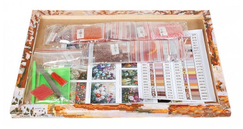 В набор входит | холст на подрамнике с листом оргалита, искусственные стразы, пинцет, пластмассовый лоток для страз, пластмассовый карандаш для камней, жидкий клей |