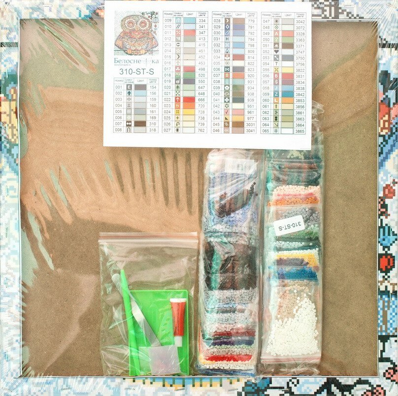 | В набор входит | холст на подрамнике с листом оргалита, искусственные стразы, пинцет, пластмассовый лоток для страз, пластмассовый карандаш для камней, жидкий клей |