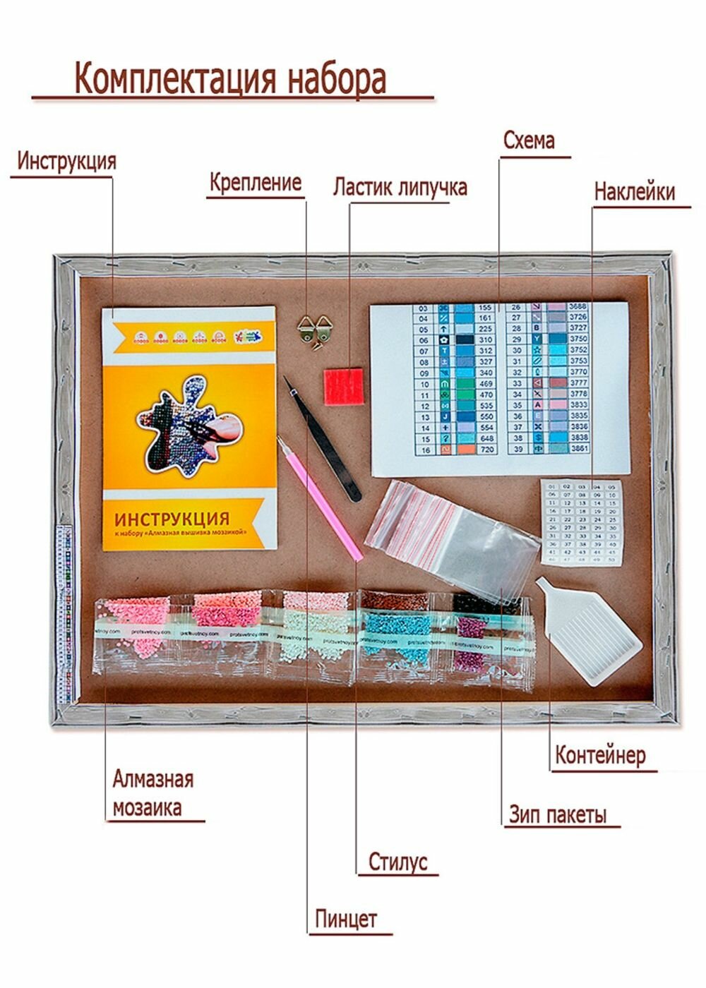 | В набор входит | натянутый на подрамник холст на тканевой основе с имитацией багета, набор страз и элементов, лоток для страз, пинцет, сухой клей, пластиковый карандаш для захвата страз и элементов, крепление для подвешивания картины на стену, инструкция |