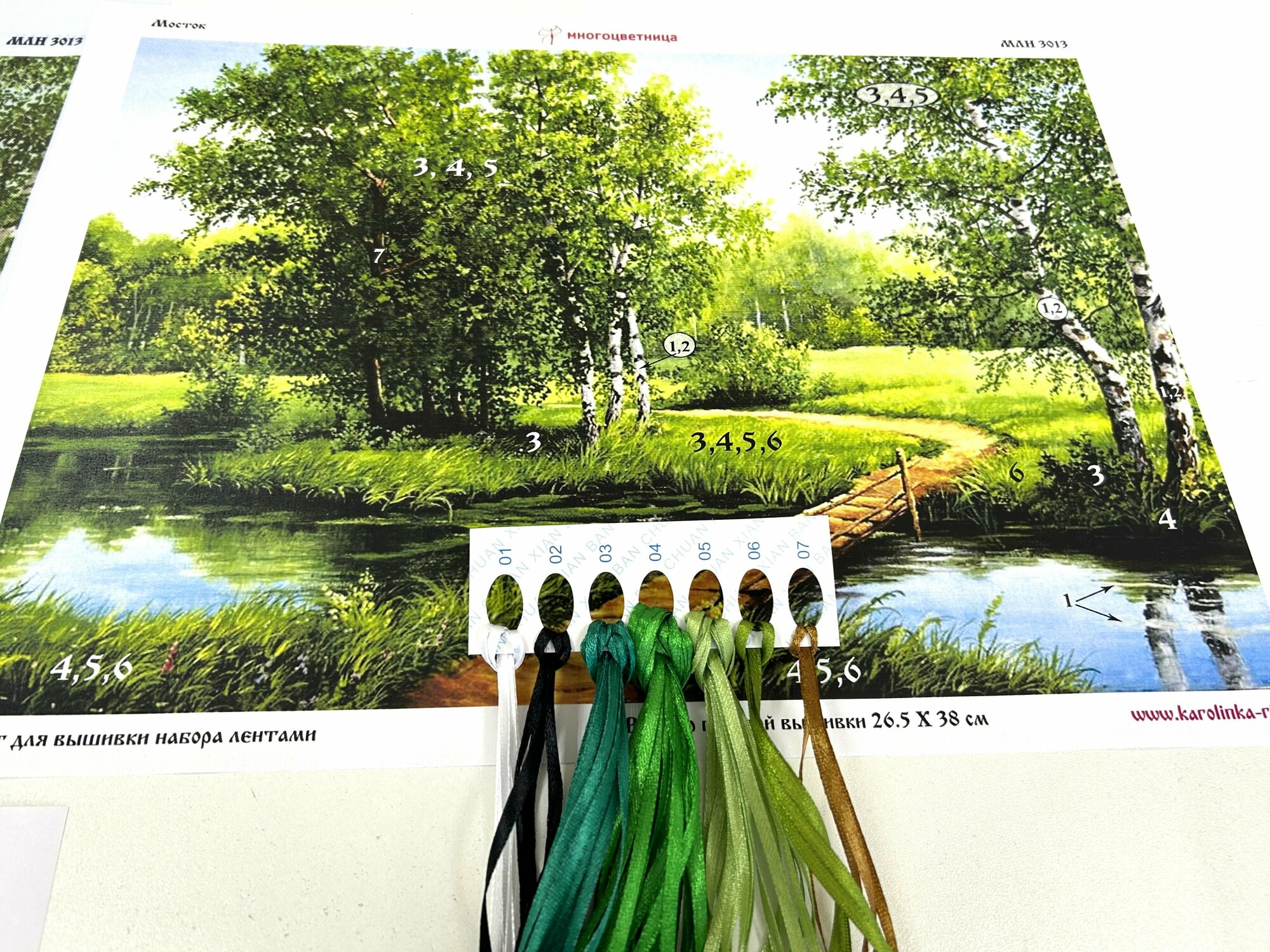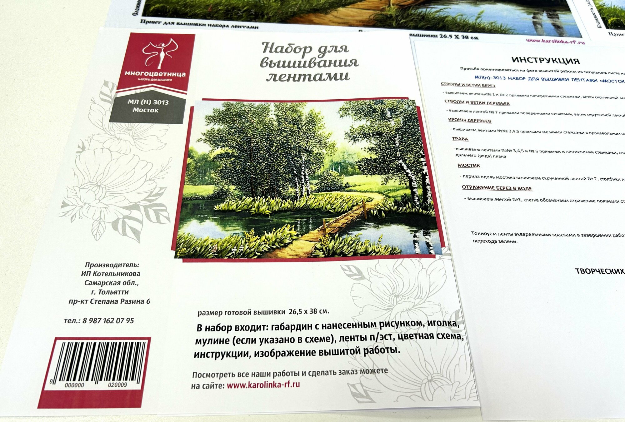 | В набор входит | ткань с нанесенным рисунком (габардин), ленты атласные разных размеров (100% полиэстер) на органайзере, мулине х/б на органайзере (если указано в схеме), иголка , цветная схема на бумаге, 2 инструкции, изображение вышитой работы |