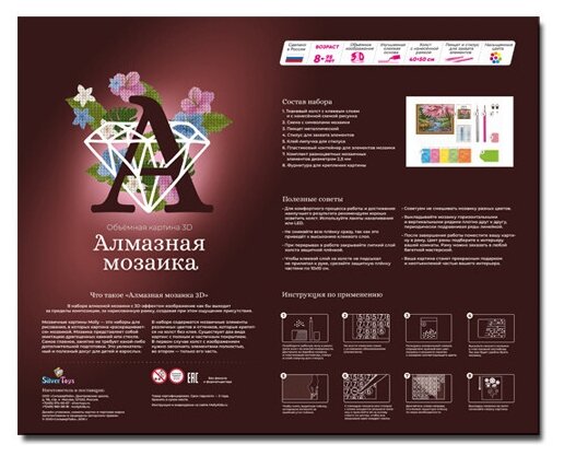 | В набор входит | тканевый холст с клеевым слоем и с нанесенной схемой рисунка, металлический пинцет, пластиковый контейнер для элементов мозаики, специальный карандаш, клей-липучка для карандаша, комплект разноцветных мозаичных элементов диаметром 2,7 мм |