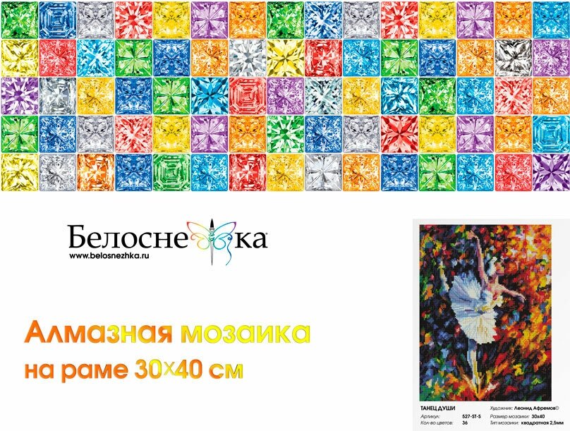 Набор для творчества Алмазная мозаика на подрамнике: 527-ST-S Танец души Познакомьтесь с чудесным набором из серии Алмазная мозаика на подрамнике от торговой марки «Белоснежка». По сюжету картины художника Леонида Афремова перед вами предстаёт изящная балерина в пачке, силуэт которой изображён с тонкостью до самых кончиков пальцев. Выкладывая мозаику, позвольте артистке балета засиять на холсте так же, как она это делает в оригинальном варианте! Основа работы – холст, на котором напечатана цветная схема с контрастными условными обозначениями, поверх нанесено клеевое покрытие и защищающая прозрачная плёнка. Используя прилагающийся металлический пинцет и комплект квадратных акриловых камней 2,5*2,5 мм, вы отлично справитесь с заполнением каждого участка картины. Постепенно заполняя ряды камешками, вы будете в восторге от высокой детализации изображения. Блестящее воспроизведение оригинала!