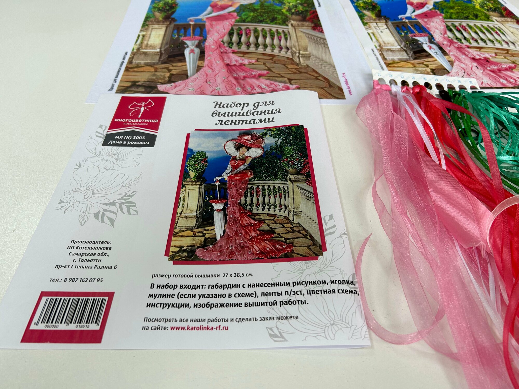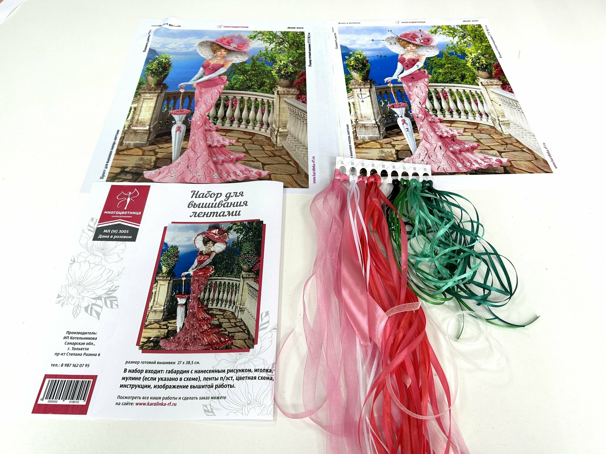 | В набор входит | ткань с нанесенным рисунком (габардин), ленты атласные разных размеров (100% полиэстер) на органайзере, мулине, игла, цветная схема на бумаге, 2 инструкции |
