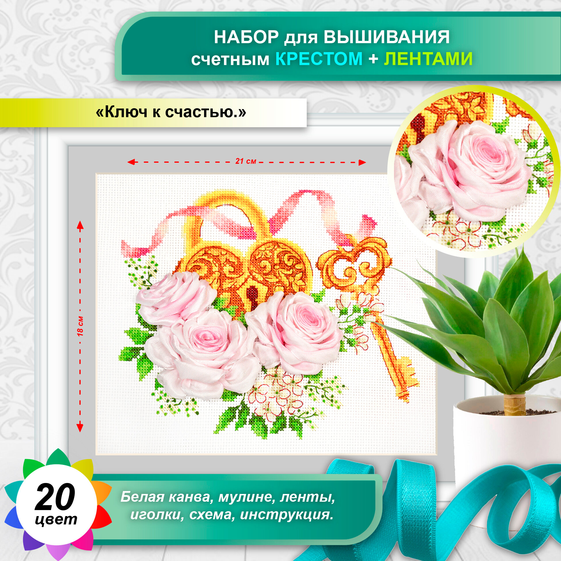 | В набор входит | канва Aida 14 белого цвета, мулине СХС (аналог DMC полиэстр) 20 цветов на органайзере, ленты атласные (100% полиэстер) на органайзере, 2 иглы, цветная символьная схема, инструкция |