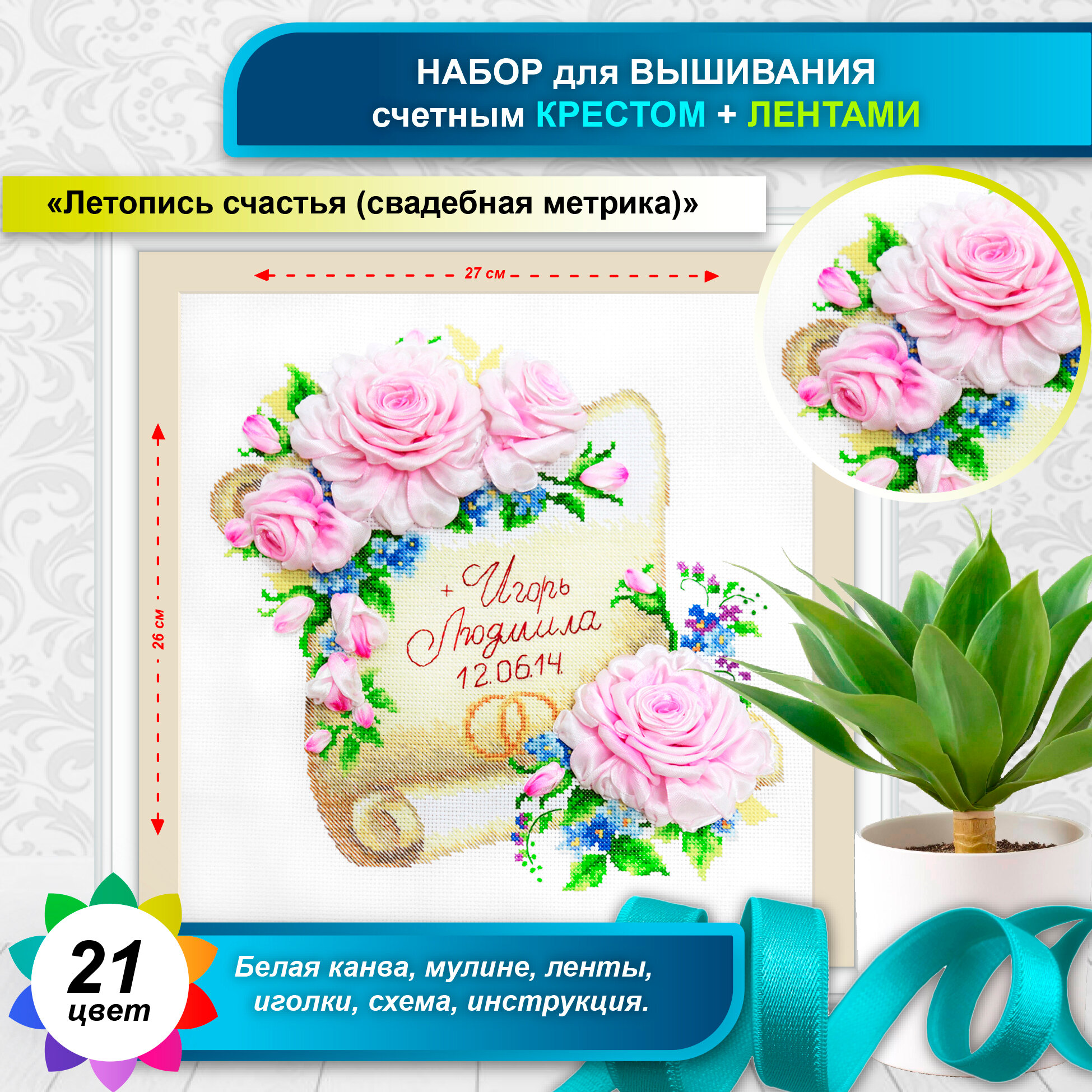 | В набор входит | канва Aida 14 белого цвета, мулине СХС (аналог DMC, полиэстр) 21 цвет на органайзере, ленты атласные (100% полиэстер) на органайзере, 2 иглы, цветная символьная схема на бумаге, инструкция |