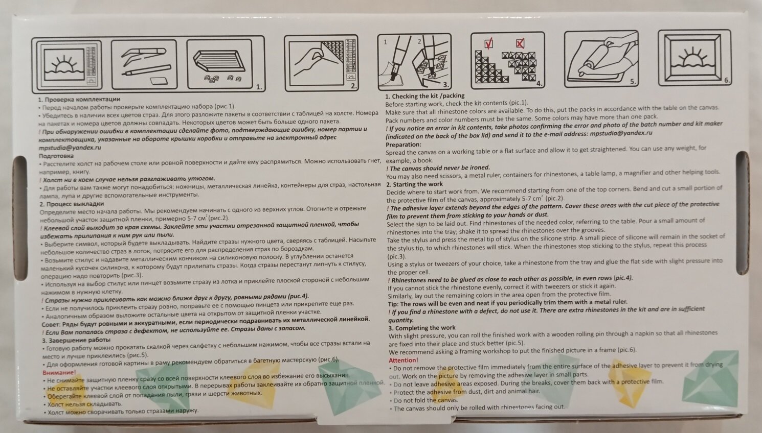 | В набор входит | Холст с клеевым слоем и условными обозначениями (схема), акриловые клеевые стразы 2,5*2,5 мм - 12 цветов, стилус, пинцет, контейнер для страз прямоугольный, силикон, инструкция. |