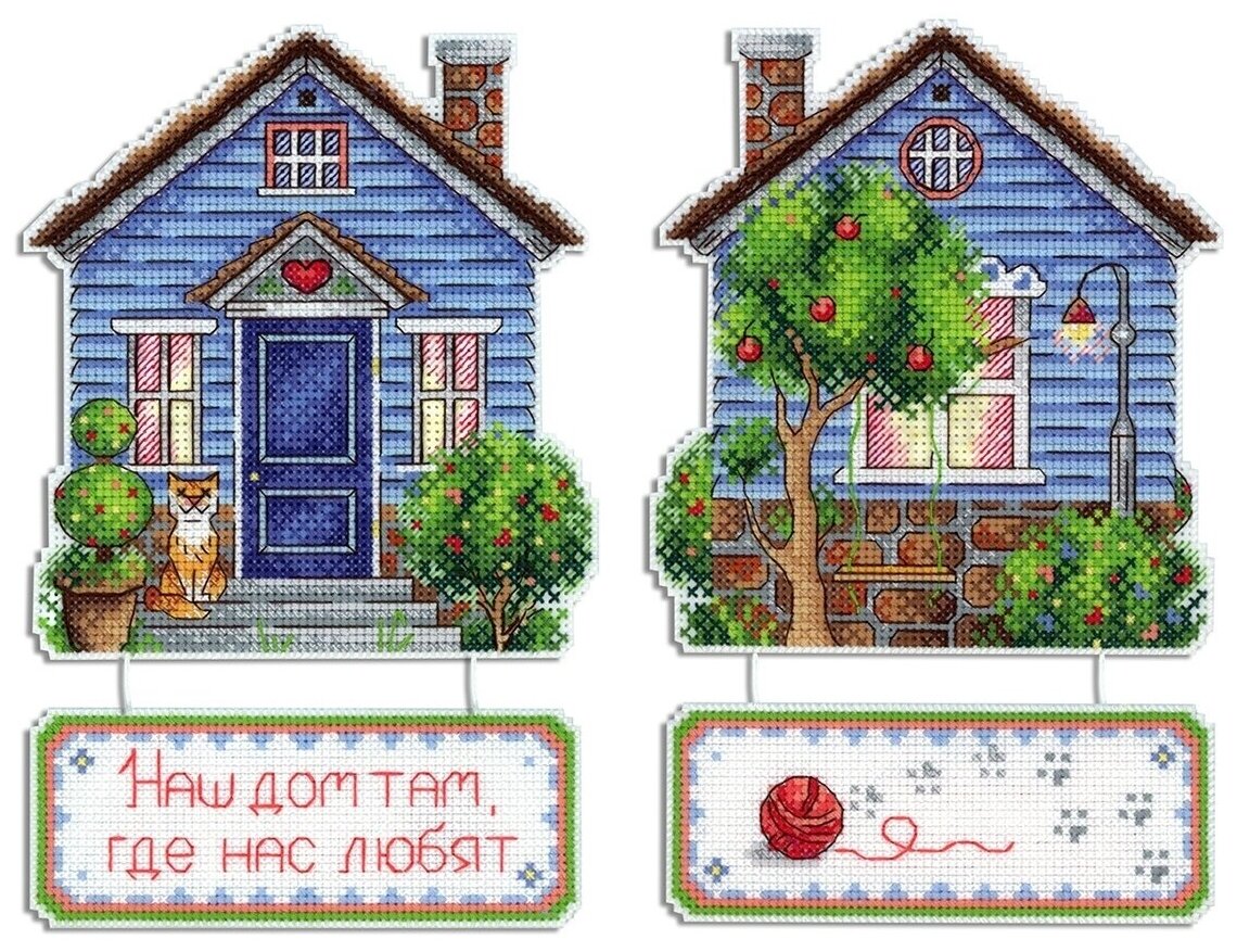 Сделайте своими руками яркий сувенир-подвеску 'Дом, где нас любят' – это увлекательно и быстро. Набор подойдет даже начинающим, достаточно проявить терпение, аккуратность и освоить простую технику 'крест'. Пяльцы или рамки не понадобятся – пластиковая канва отлично держит форму. Готовые элементы надо вырезать по контуру и соединить между собой аккуратными стежками. При желании между деталями игрушки можно вклеить или вшить ленту-подвес.