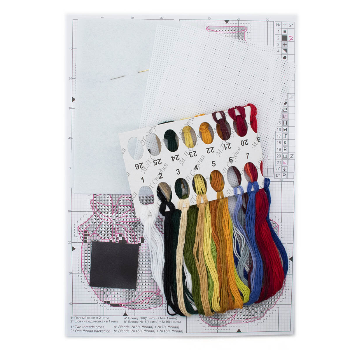 | В набор входит | пластиковая канва, мулине, фетр, магнитное полотно, черно-белая символьная схема, инструкция |