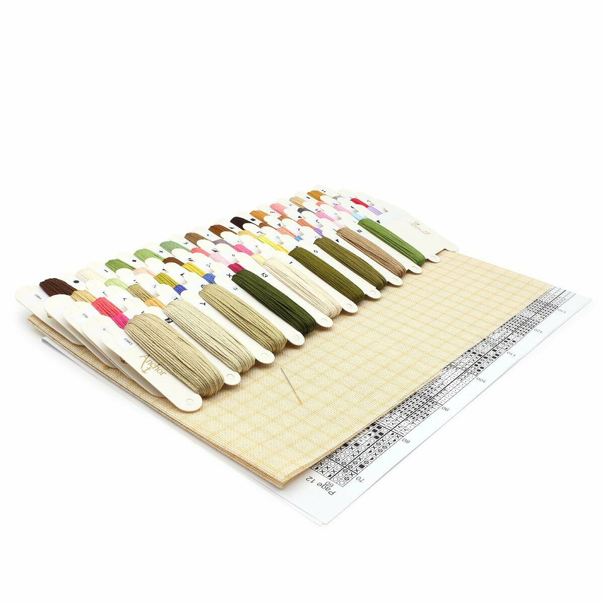 | В набор входит | канва гобеленовая светло-бежевого цвета (разлинованная) 100 клеток в 10 см., хлопковое мулине Anchor 57 цветов, черно-белая символьная схема, игла, инструкция по вышиванию |