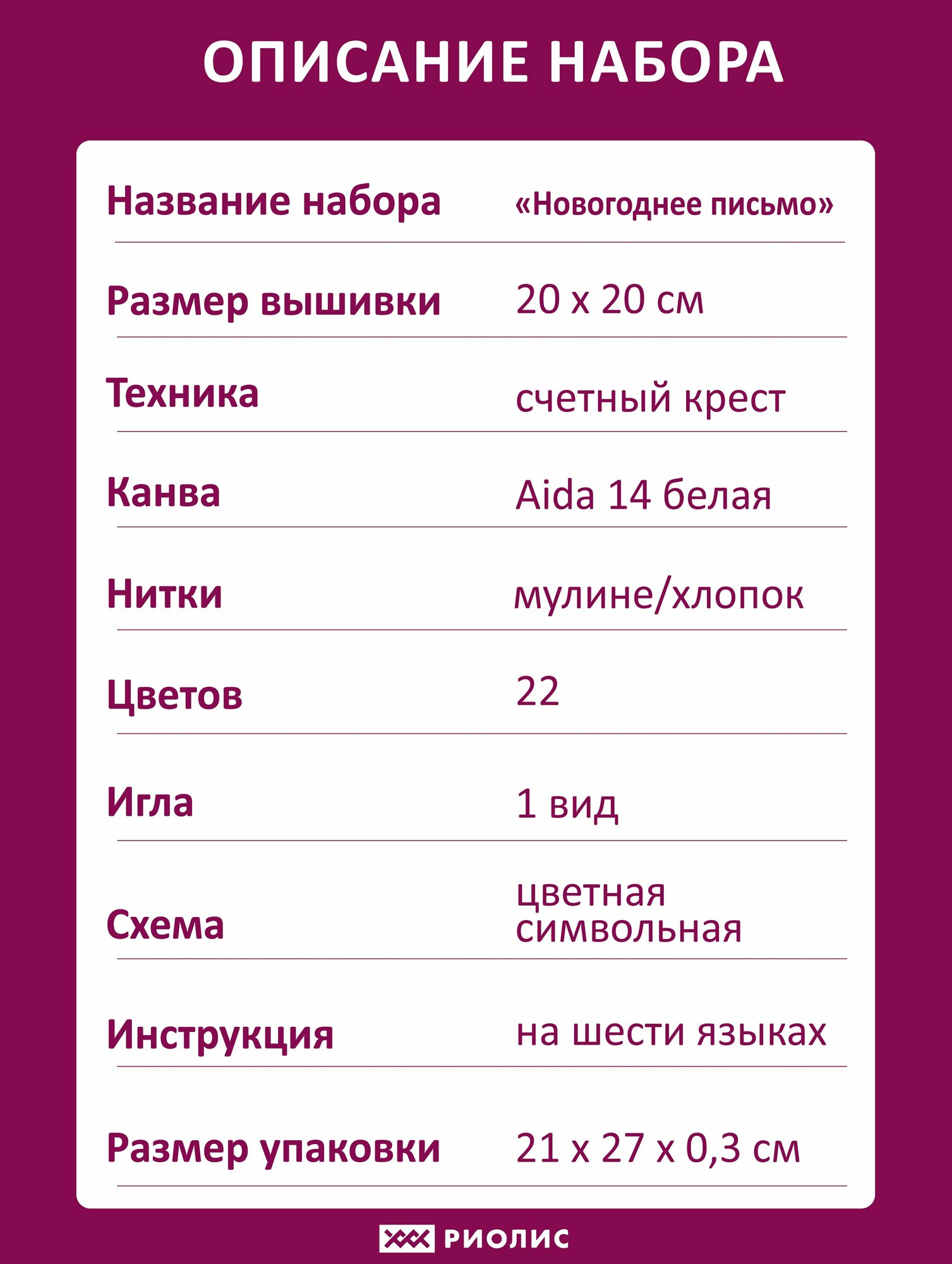 Вышивание - популярное и увлекательное хобби, которое дарит радость и умиротворение. Набор для вышивания - самый удобный вариант вышивок, как для начинающих, так и для опытных мастеров. Ведь набор содержит все необходимые материалы для создания настоящего шедевра. Отличный результат гарантирован! Вышивке всегда можно найти практическое применение. А вышитая собственноручно готовая картина станет отличным подарком близкому человеку. Она будет радовать долгие годы, даря любовь и тепло. Набор для вышивания "RIOLIS" "Сотвори Сама" 1907 "Новогоднее письмо" 20 х 20 см. Заполнение: Частичное. Количество цветов: 22. Схема: Цветная. Тема: Зимнее настроение. Техника исполнения: Бэкстич, Счетный крест. Тип канвы/ткани: Aida 14. Цвет канвы/ткани: белый. Размер готовой работы: 20 x 20 см.