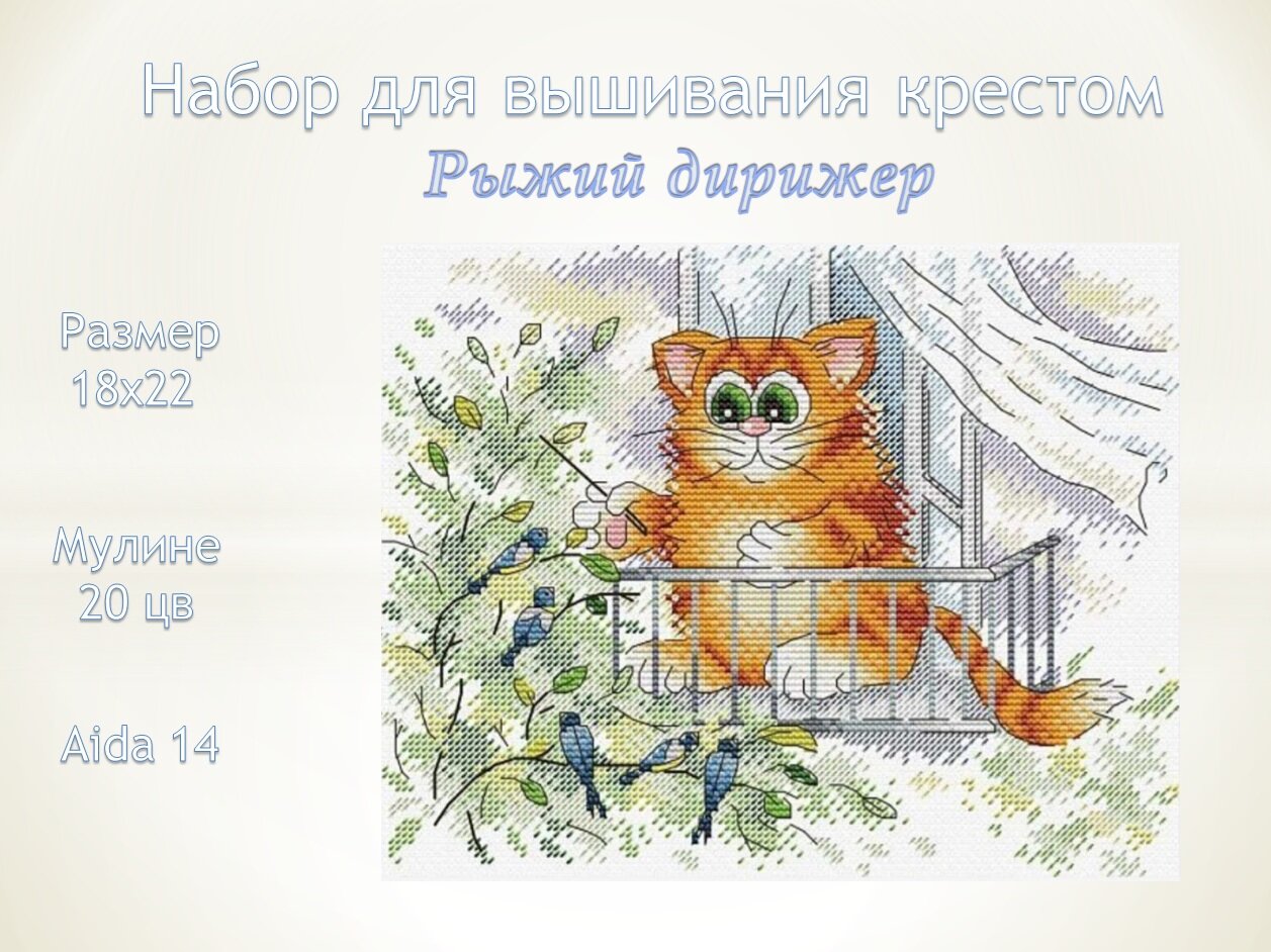 | В набор входит | канва Аида №14, нитки мулине 20 цветов, схема и руководство по вышиванию |