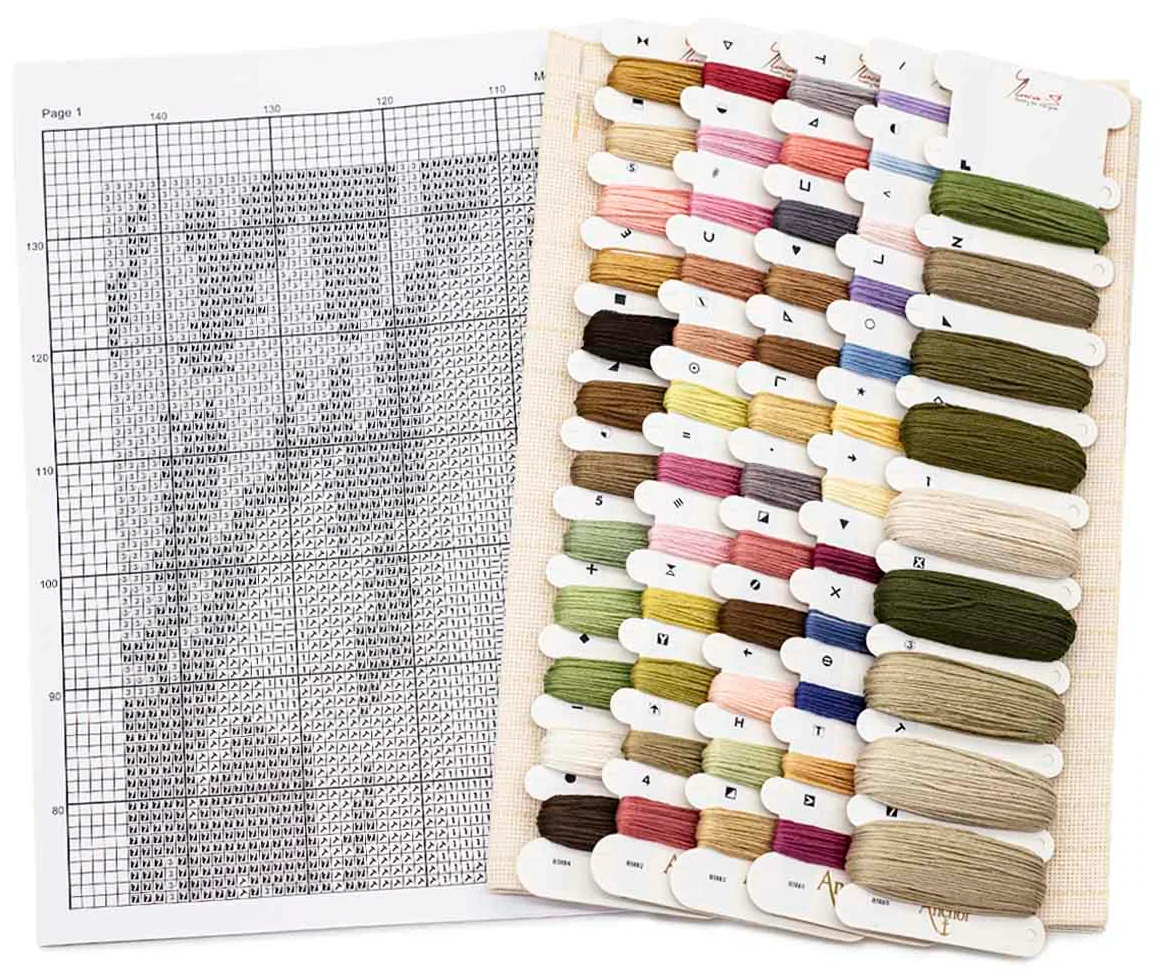 В набор входит | канва Aida 18 ct белого цвета, хлопковое мулине Anchor (57 цветов), черно-белая символьная схема, игла, инструкция по вышиванию |