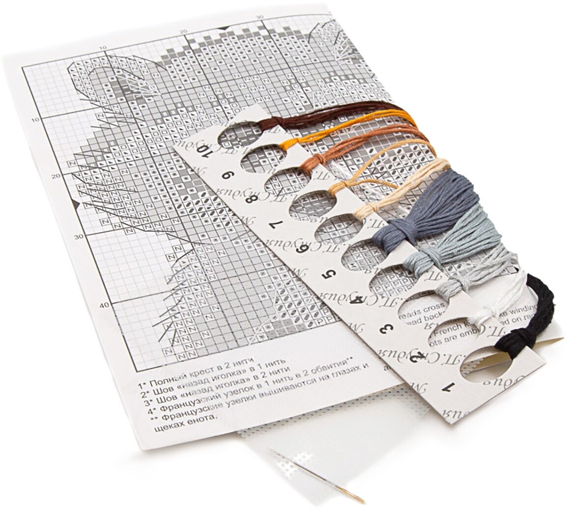 | В набор входит | водорастворимая канва (соответствует 14 ct), нитки мулине ПНК им. Кирова (10 цветов), черно-белая символьная схема и подробное руководство по выполнению работы. |