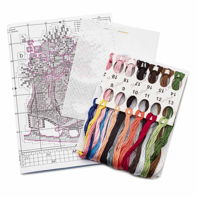 В наборе: канва пластиковая Aida №14, нитки мулине, разобранные на органайзере, игла, схема и инструкция.