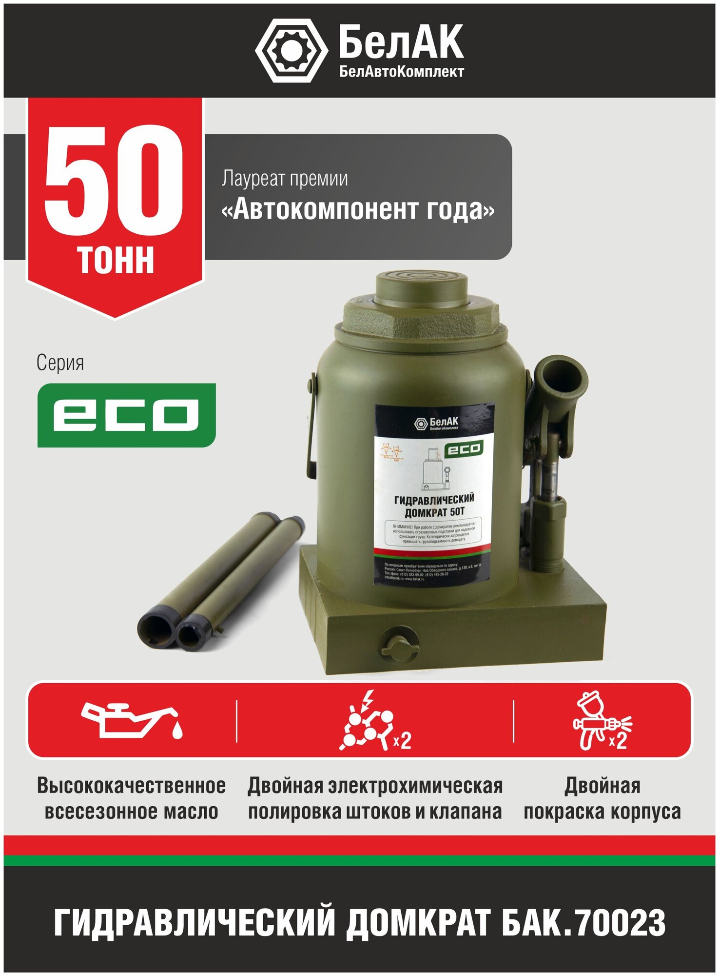 | Описание | Гидравлический домкрат БелАК 50 т, ECO БАК.70023 разработан российским производителем «БелАК», награждённым двумя национальными премиями «Автокомпонент года» и «Автоаксессуар года» за высокое качество и надежность выпускаемых домкратов. Продукция «БелАК» соответствуют нормам сертификации ISO9001 и ЕАС.,,Домкрат служит для плавного и безопасного подъема автотранспорта весом не более 50 т.,,Двойная электрохимическая полировка гарантирует защиту штока домкрата от коррозийного налета и устраняет неровности, которые могут повредить уплотнительные манжеты.,,Деликатная двойная покраска корпуса домкрата надежно защищает его от механических повреждений и значительно продлевает срок службы. Электрохимическая обработка клапана домкрата также защищает от возникновения коррозии. Специальное гидравлическое масло работает в широком диапазоне температур (+/- 50 °C). К очевидным преимуществам гидравлических домкратов относятся плавность хода и торможения штока.,,Модель изготовлена из металла вторичной переработки с использованием современной технологии и оборудования, позволяющих сохранить высокие характеристики домкрата при снижении стоимости основного сырья.,,В комплект поставки входит съемный складной рычаг, который обеспечивает снижение рабочего усилия. |