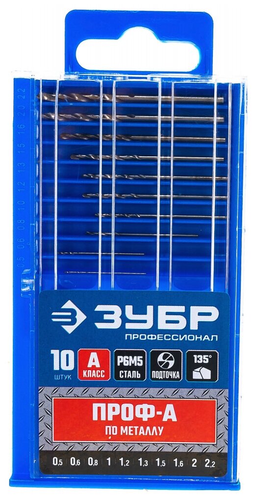 ЗУБР ПРОФ-А, 10 шт, (0.5-2.2 мм), сталь Р6М5, класс А, для печатных плат, набор сверл по металлу, Профессионал ()
