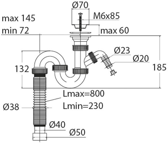 Сифон для кухонной мойки прямоточного (проточного, трубного) типа c разборным выпуском и решеткой из нержавеющей стали предназначен для отведения воды в систему канализации. Препятствует проникновению неприятных запахов из канализации. Сифон укомплектован отводом для подключения бытовой техники. Скорость слива 28 л/мин. Сифон укомплектован гибким соединением - гофротрубой, 40х40/50 длина 800 мм. Решетки выпуска и перелива изготовлены из нержавеющей стали