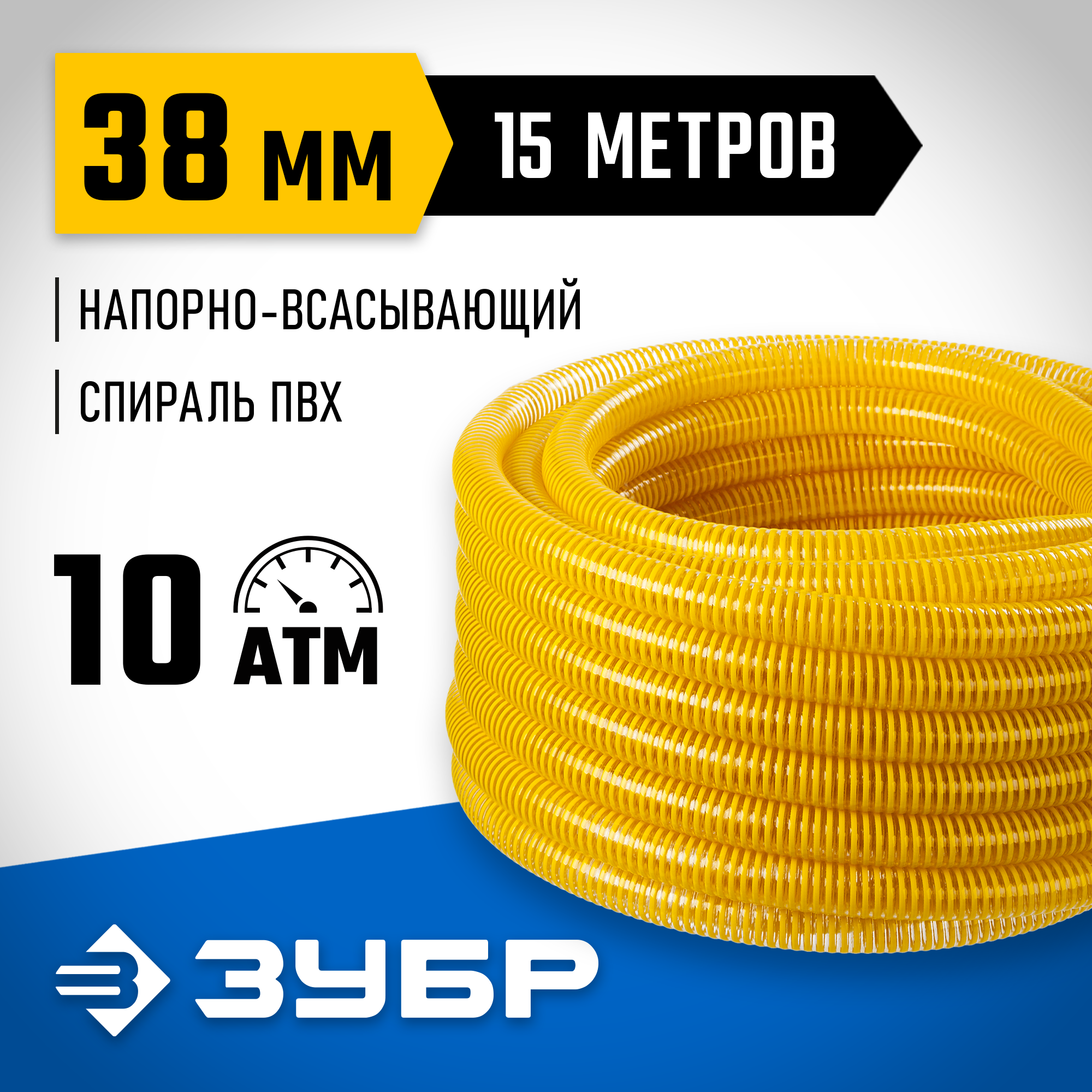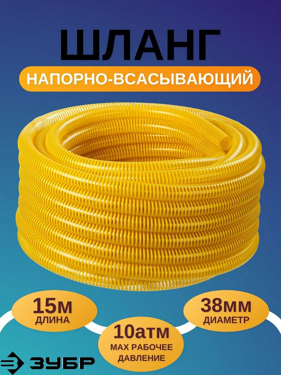 ЗУБР Шланг напорно-всасывающий со спиралью ПВХ, 10 атм, 38мм х 15м