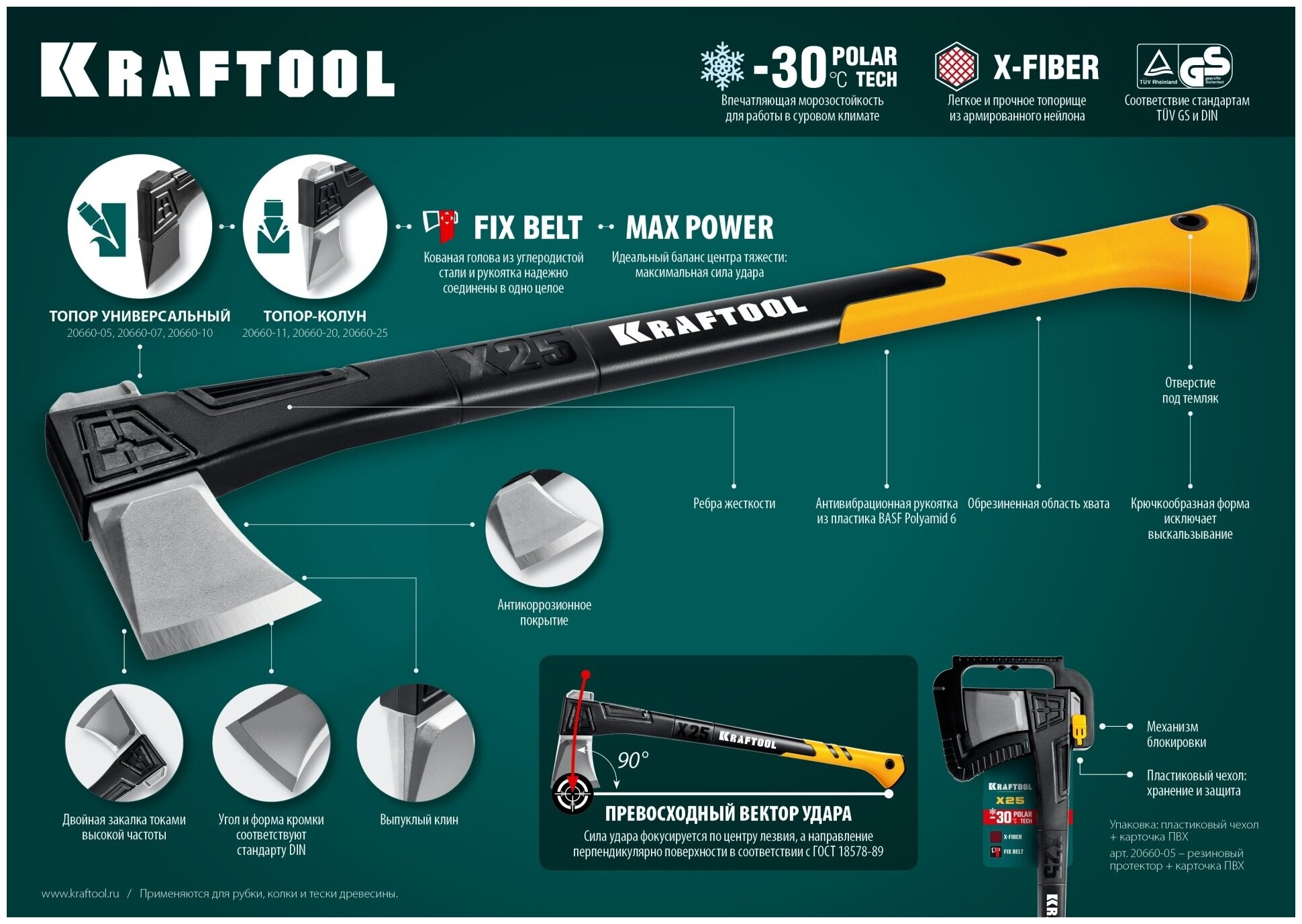 Универсальный топор KRAFTOOL X5 440/620 г, в чехле, 230 мм - это профессиональный, надежный инструмент, произведенный по немецким технологиям. Топорище выполнено из армированного нейлона X-Fiber - легкого и прочного материала. Выпуклый клин обеспечивает эффективность в работе и легкое извлечение из бревна.