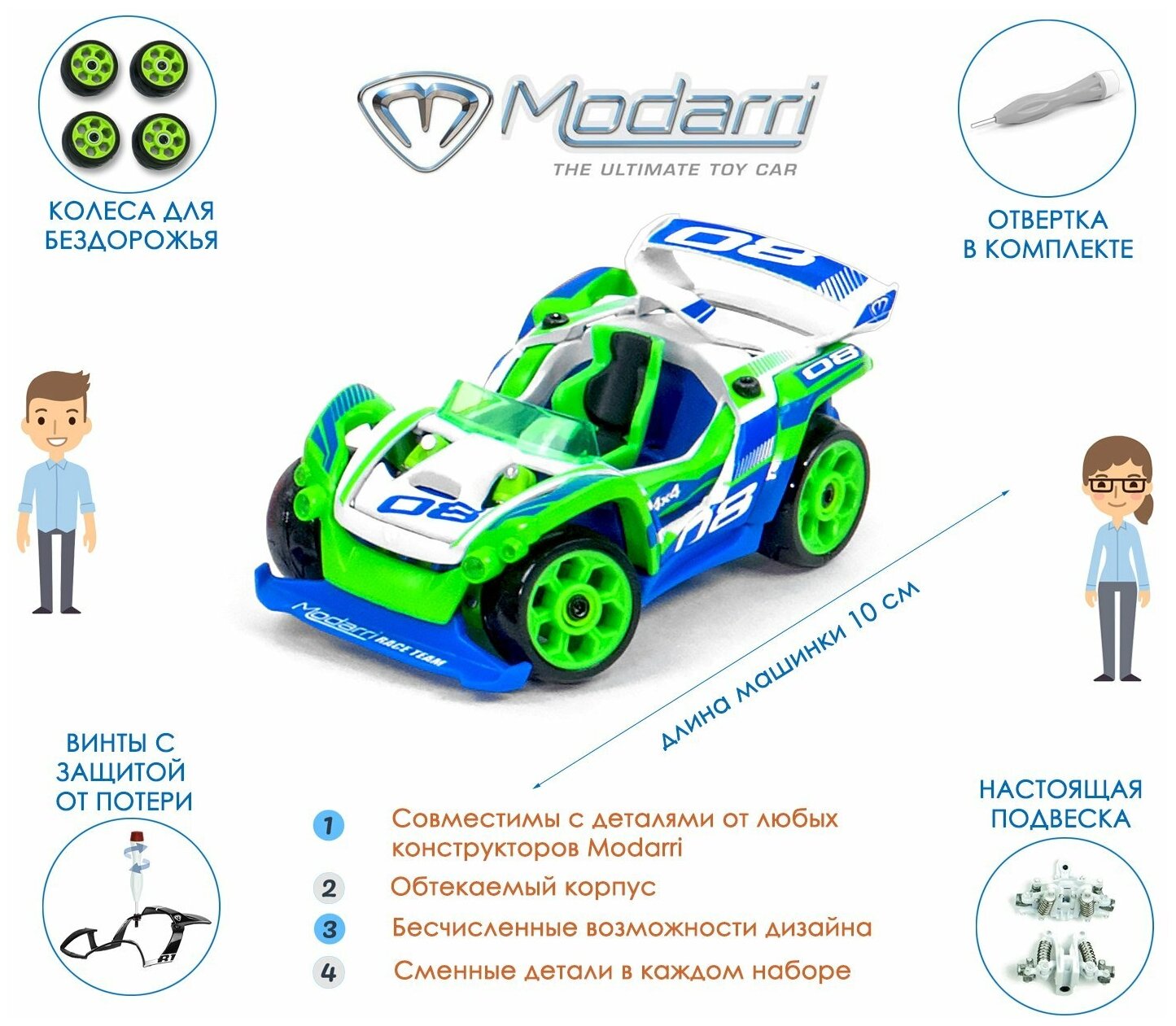 Машинки Modarri – это модульная система, элементы которой универсальны и легко комбинируются. Винтики, используемые здесь, не выпадают. Просто ослабьте их и замените детали. А теперь просто поставь палец на водительское сиденье и движение машинки под твоим контролем!