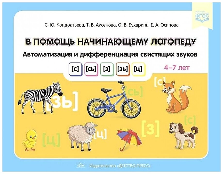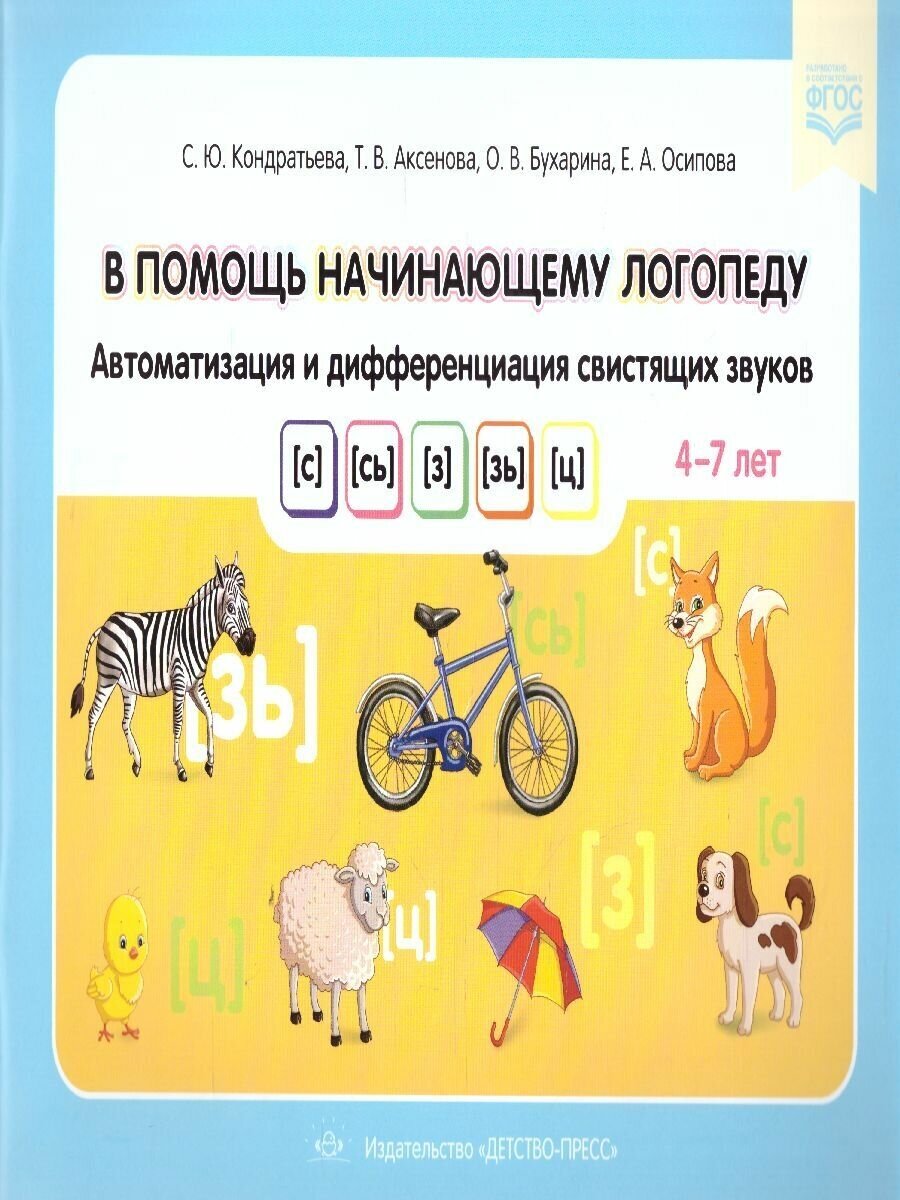 В помощь начинающему логопеду. Автоматизация и дифференциация свистящих звуков [с] [сь] [з] [зь] ("Кондратьева Светлана Юрьевна; Бухарина О. В.;Аксенова Т. В. "); Детство-Пресс, 2021
