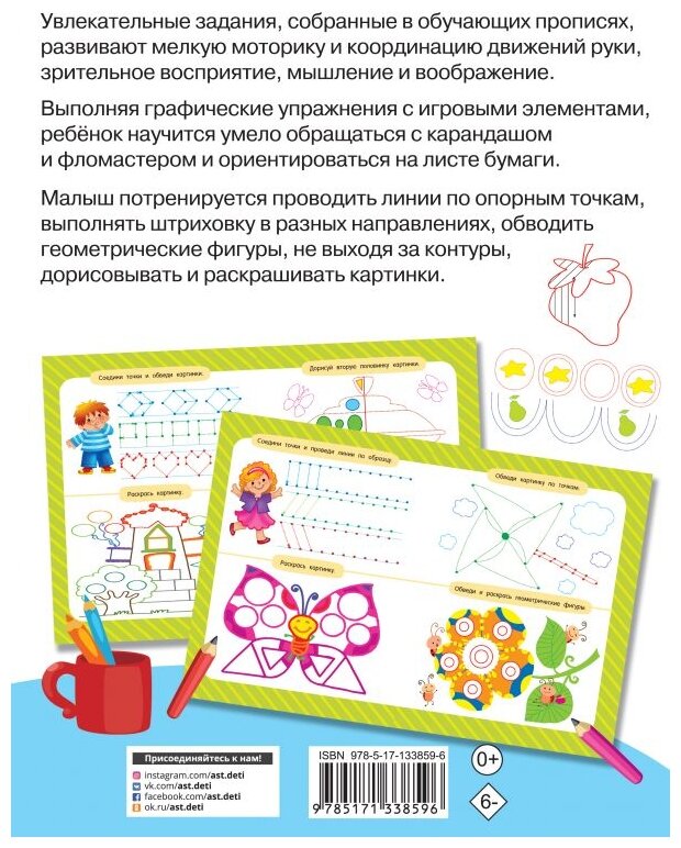 Увлекательные задания, собранные в книжке "Самые первые прописи: штрихуем, обводим, рисуем", развивают мелкую моторику и координацию движений руки, зрительное восприятие, мышление и воображение. Выполняя графические упражнения с игровыми элементами, ребёнок научится обводить по контуру, дорисовывать, выполнять штриховку, проводить линии и рисовать картинки по опорным точкам. Малыш научится ориентироваться на листе бумаги, умело обращаться с карандашом и фломастером, а весёлые картинки сделают первые уроки чистописания более успешными.