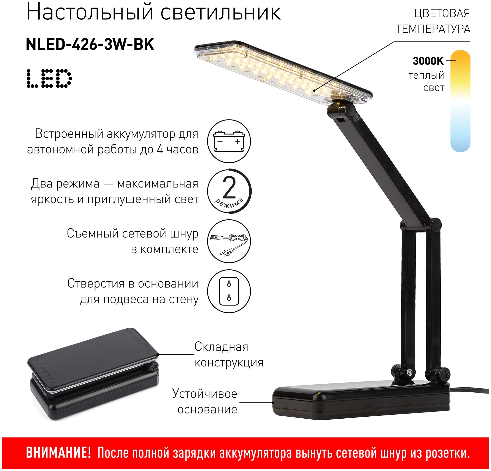Настольный аккумуляторный светильник со светодиодами (LED), 4W Аккумулятор для автономной работы. Два режима - максимальная яркость и приглушенный свет. Съемный сетевой шнур в комплекте. Устойчивое основание, складная конструкция. Теплый свет, аналогичный свету лампы накаливания - цветовая температура 3000К.
