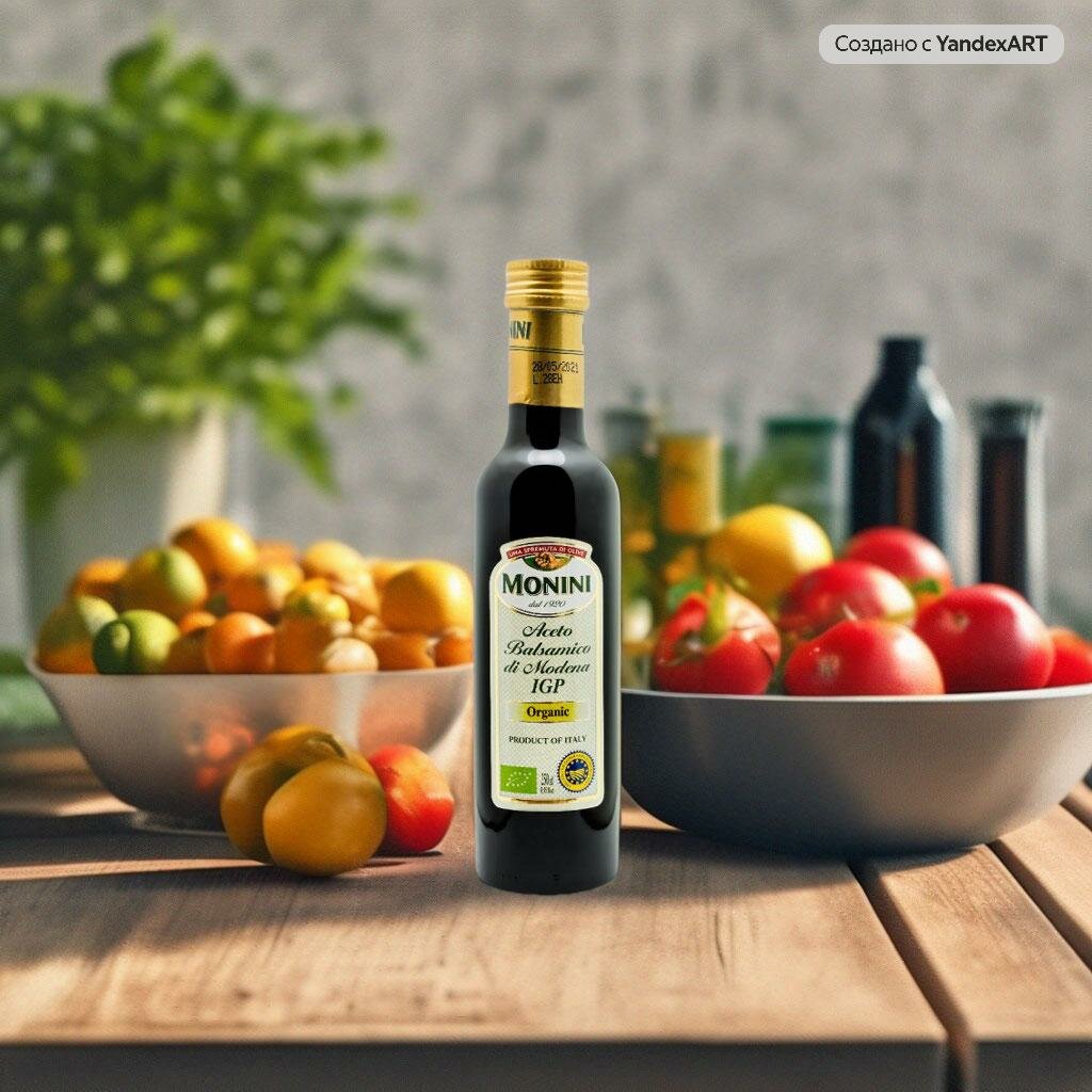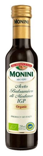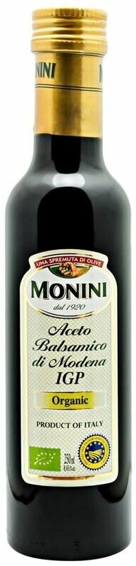 Monini Уксус винный бальзамический из Модены получают путем смешивания сваренного виноградного сусла и высококачественного уксуса. Продукт производят исключительно из органических ингредиентов, он имеет богатый насыщенный вкус и идеально подходит для салатов, мяса, рыбы в сочетании с оливковым маслом первого холодного отжима.