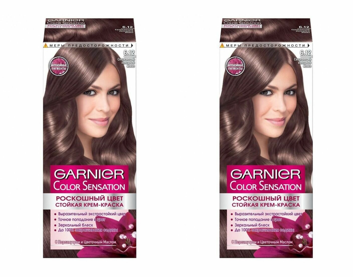 Стойкая крем-краска с интенсивными пигментами для еще более насыщенного и стойкого цвета до 10 недель. Обеспечивает точное попадание в тон и покрытие до 100% седины. Формула краски дополнительно обогащена маслом розы, чтобы ухаживать за вашими локонами во время и после окрашивания: увлажняет волосы и кожу головы, не вызывает чувство дискомфорта. Перламутровые частицы в составе отражают свет и переливаются, придавая волосам эффект зеркального полотна. После окрашивания ваши волосы мягкие, шелковистые и потрясающе блестящие. Оттенок 6.12 «Сверкающий холодный мокко» Garnier Color Sensation – светло-каштановый цвет с холодным жемчужно-пепельным отливом. Результат: Точное попадание в цвет. Интенсивный оттенок. Зеркальный блеск. До 100% закрашивания седины. Стойкость до 8-10 недель. В комплект входит: флакон с молочком-проявителем (60 мл); тюбик с крем-краской (40 мл); крем-уход после окрашивания (10 мл); инструкция; пара перчаток. В комплекте 2 шт