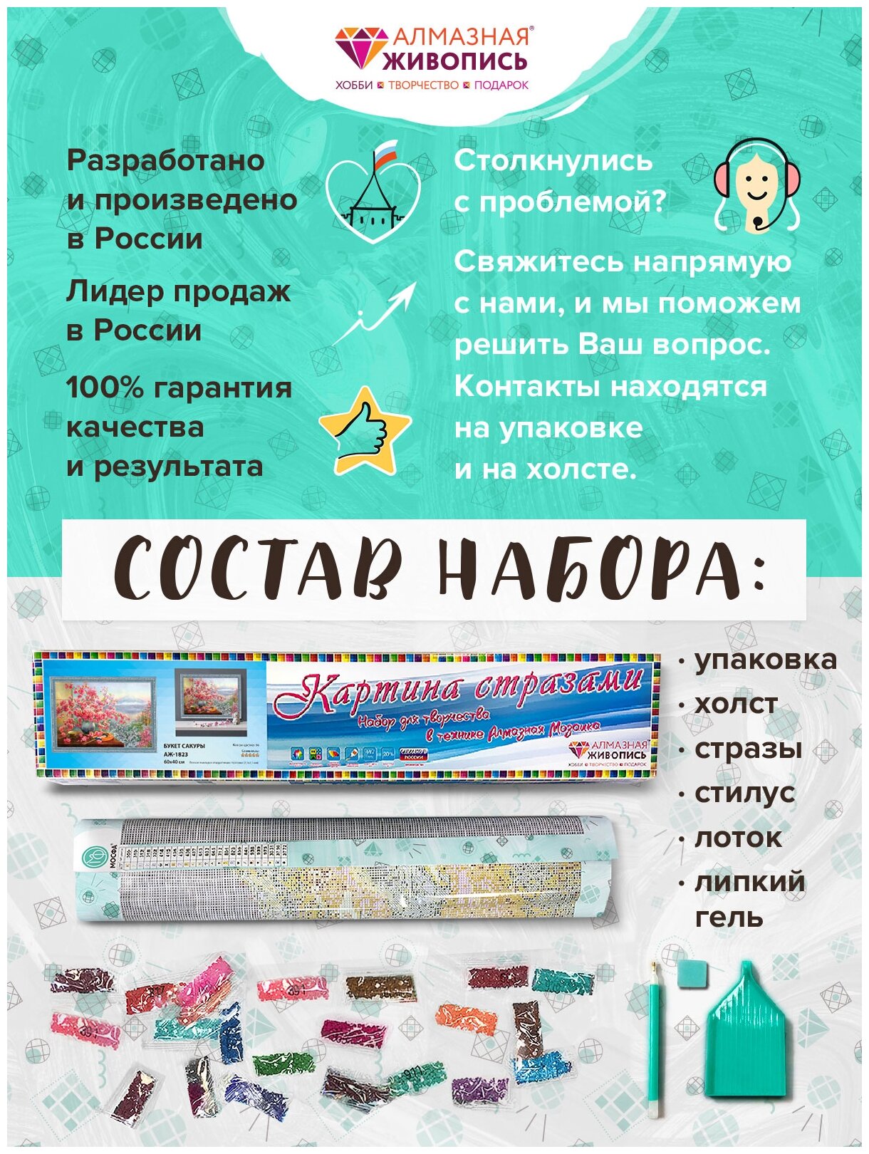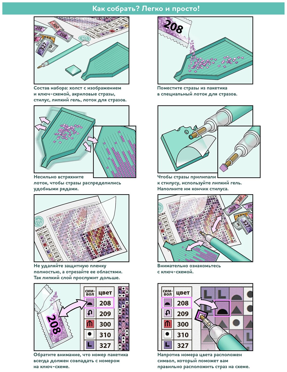 | В набор входит | полотно-схема с клеевым слоем, с условными обозначениями, инструкция, пластиковое блюдце, стилус, упакованные стразы |