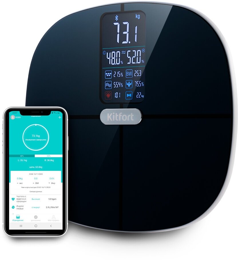Kitfort Весы представляет поколение умных весов. Они обеспечивают высокую точность измерения и станут неизменным спутником для людей, следящих за весом. Внутри весов встроены датчики, встав на которые проводится диагностика тела. Далее весы легко синхронизируются с приложением Fitdays по Bluetooth, где будут отражены показатели вашего тела. Вся информация будет храниться у вас в телефоне. В течение 5 секунд после взвешивания, в приложении отразятся важнейшие параметры вашего тела. Среди них: вес, возраст тела, содержание воды, белка, жира и костной массы в вашем организме, общий баланс вашего тела и многие другие. Чтобы узнать вес ребёнка, активируйте режим Baby Mode, предварительно встав на весы без него, а затем вместе. Весы сами рассчитают вес ребёнка и запомнят его. Весы запоминают информацию по каждому пользователю, всего можно добавить до 24 человек. Весы оснащены жидкокристаллическим дисплеем с крупными цифрами, что делает их использование максимально удобным. Весы выполнены из закалённого стекла, которое лишь на первый взгляд кажется хрупким: на самом деле оно выдерживает массу до 180 кг. Весы имеют стильный и привлекательный дизайн, благодаря чему впишутся в любой интерьер. Прорезиненные ножки обеспечивают весам дополнительную устойчивость и предотвращают их скольжение по полу, что гарантирует безопасность во время взвешивания. На обратной стороне устройства находится разъём для батареек. Низкое энергопотребление обеспечивает бесперебойную работу устройства от одного комплекта из четырёх батареек AAA. Включение и выключение весов происходит автоматически.