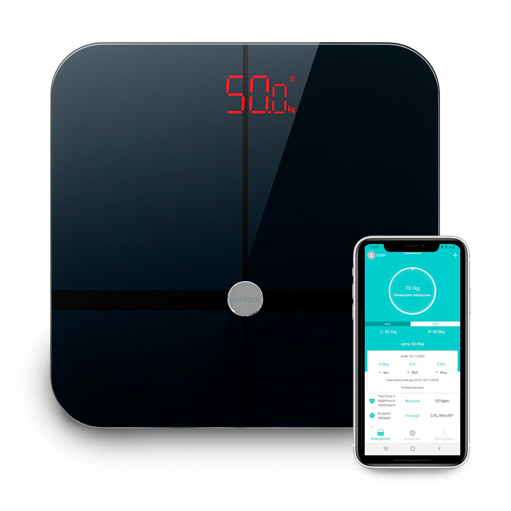 Kitfort Весы представляет поколение умных весов. Они обеспечивают высокую точность измерения и станут неизменным спутником для людей, следящих за весом. Внутри весов встроены датчики, встав на которые проводится диагностика тела. Далее весы легко синхронизируются с приложением Fitdays по Bluetooth, где будут отражены показатели вашего тела. Вся информация будет храниться у вас в телефоне. В течение 5 сек унд после взвешивания, в приложении отразятся важнейшие параметры вашего тела. Среди них: вес, возраст тела, содержание воды, белка, жира и костной массы в вашем организме, общий баланс вашего тела и многие другие. Чтобы узнать вес ребёнка, активируйте режим Baby Mode, предварительно встав на весы без него, а затем вместе. Весы сами рассчитают вес ребёнка и запомнят его. Весы запоминают информацию по каждому пользователю, всего можно добавить до 24 человек. Весы оснащены жидкокристаллическим дисплеем с крупными цифрами, что делает их использование максимально удобным. Весы выполнены из закалённого стекла, которое лишь на первый взгляд кажется хрупким: на самом деле оно выдерживает массу до 180 кг. Весы имеют стильный и привлекательный дизайн, благодаря чему впишутся в любой интерьер. Прорезиненные ножки обеспечивают весам дополнительную устойчивость и предотвращают их скольжение по полу, что гарантирует безопасность во время взвешивания. На обратной стороне устройства находится разъём для батареек. Низкое энергопотребление обеспечивает бесперебойную работу устройства от одного комплекта из четырёх батареек AAA. Включение и выключение весов происходит автоматически.