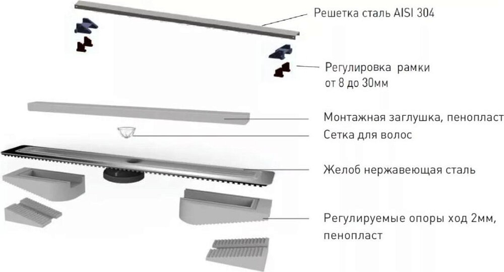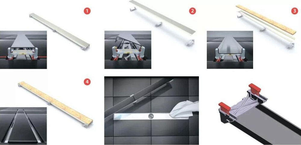 - Двусторонняя установка решетки: металл и вклейка плитки с регулировкой по высоте от 8 до 25 мм.