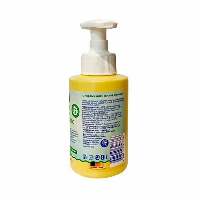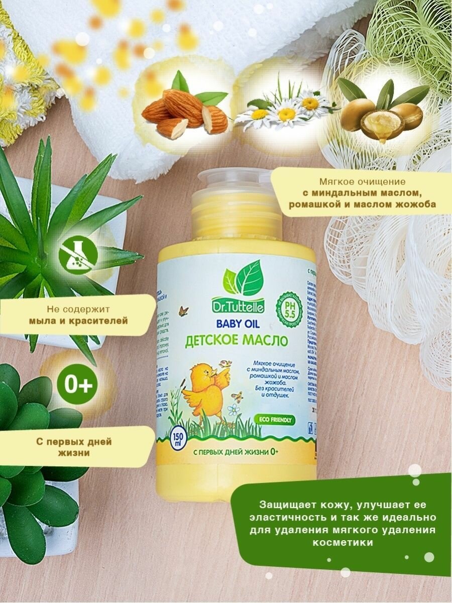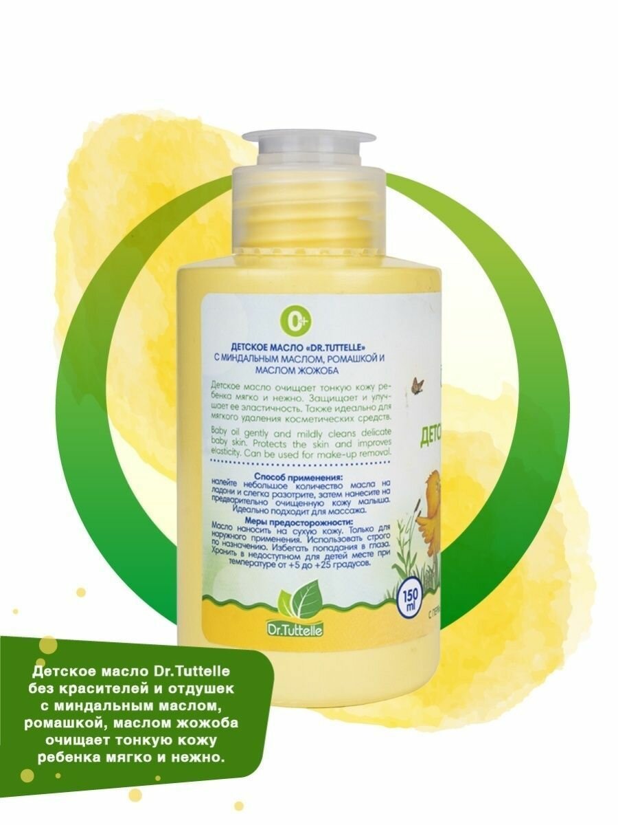 Детское масло Dr.Tuttelle без красителей и отдушек, с первых дней жизни 0+, с миндальным маслом, ромашкой, маслом жожоба очищает тонкую кожу ребенка мягко и нежно. Защищает кожу и улучшает ее эластичность.
