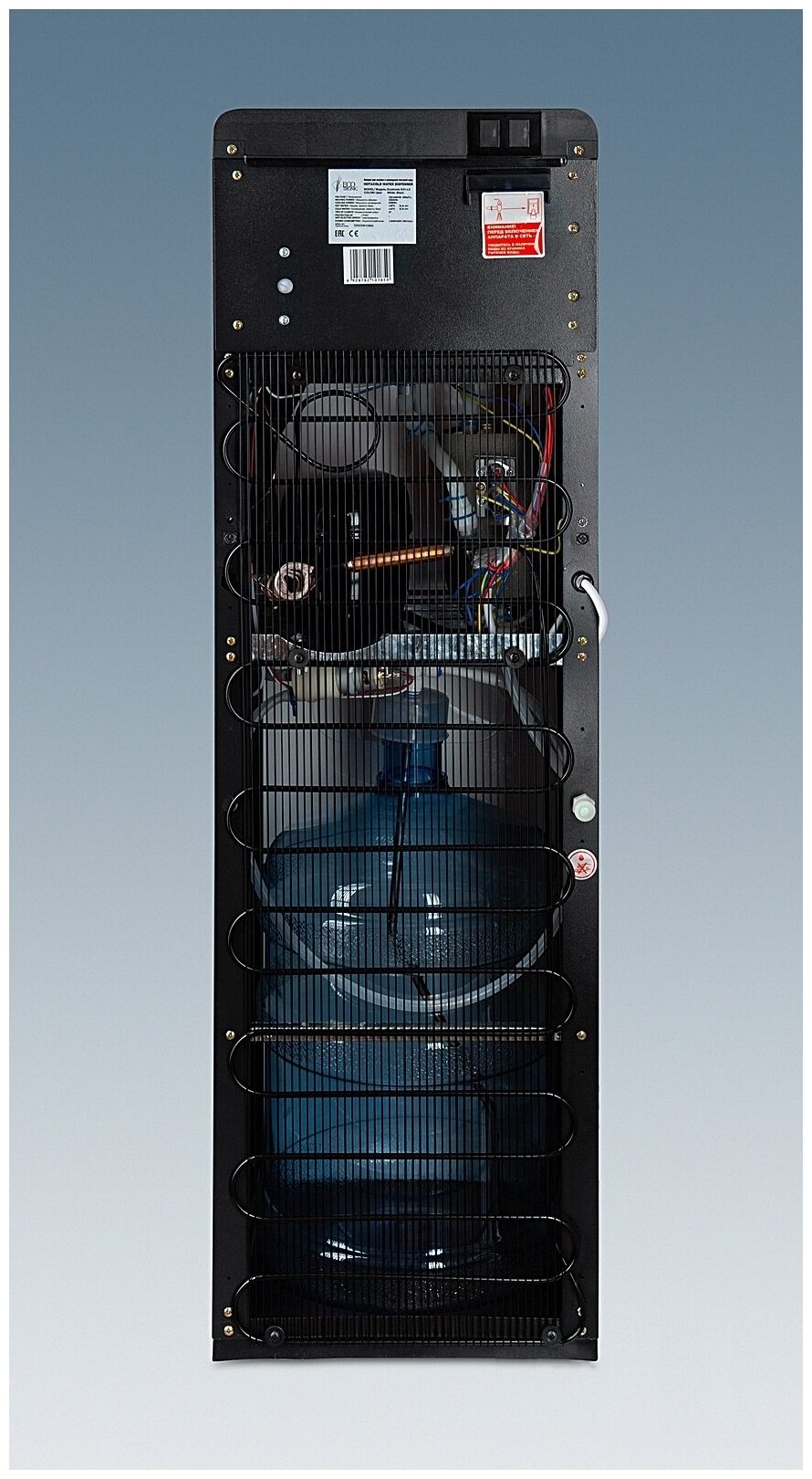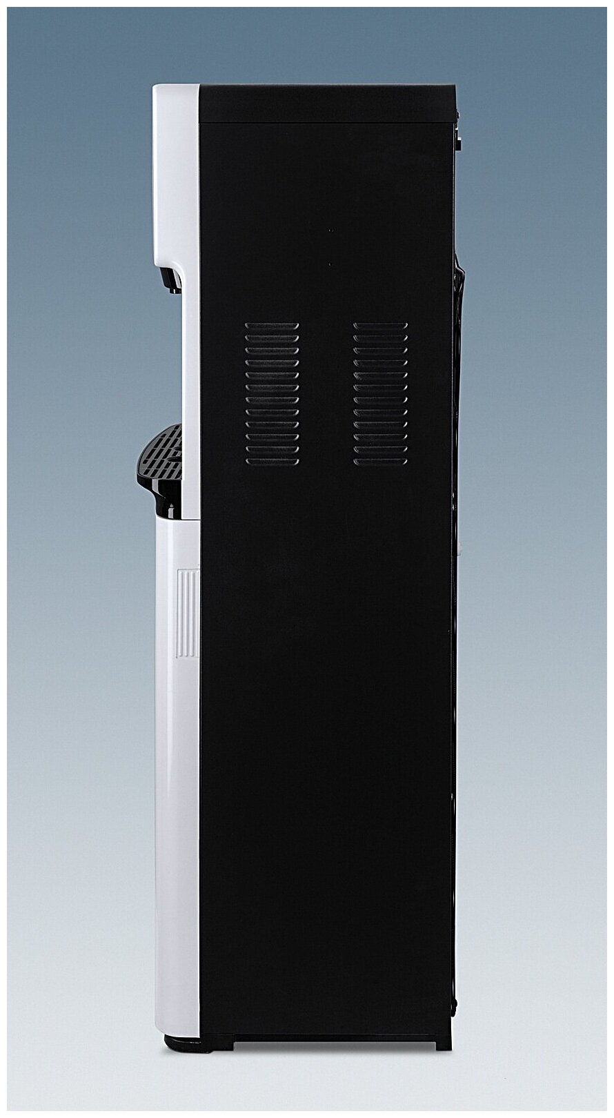 Кулер с нижней загрузкой бутыли и компрессорным охлаждением. Три крана подачи воды: горячей, холодной и комнатной температуры. Защита на кране горячей воды. Отсек для бутыли в нижней части корпуса. Светодиодная индикация режимов нагрева и охлаждения воды, а также отсутствия воды в бутыли. Передняя панель белого цвета, с черными акцентными деталями. Остальная часть корпуса черная. Тип кранов подачи воды - "клавиши".