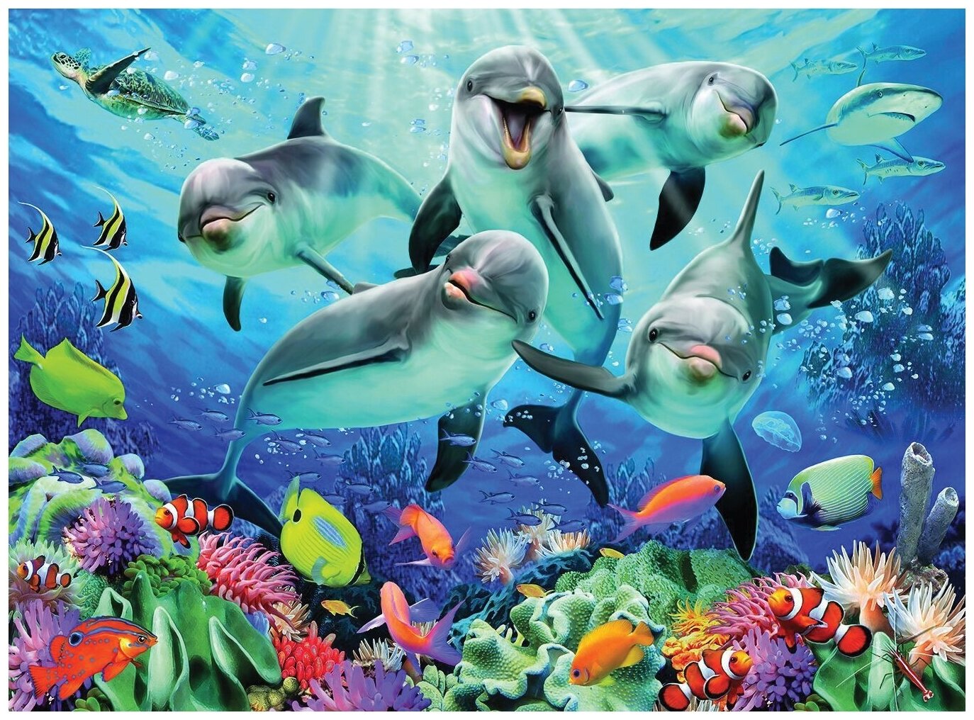 Пазл с изображением дельфинов, плавающих среди подводных рыбок и кораллов. Состоит из 500 деталей. Элементы изготовлены по технологии Softclick, плотно и легко соединяются друг с другом. Форма элементов уникальна и подходит для размещения только в определенном месте. Вырубка элементов сделана вручную.