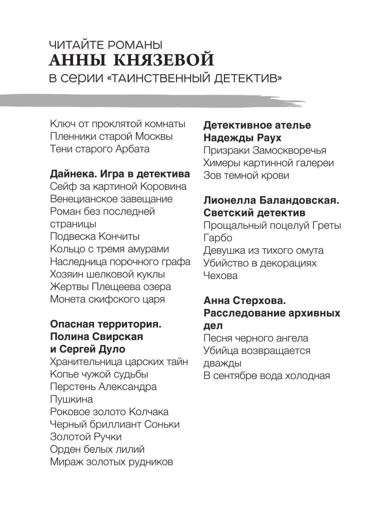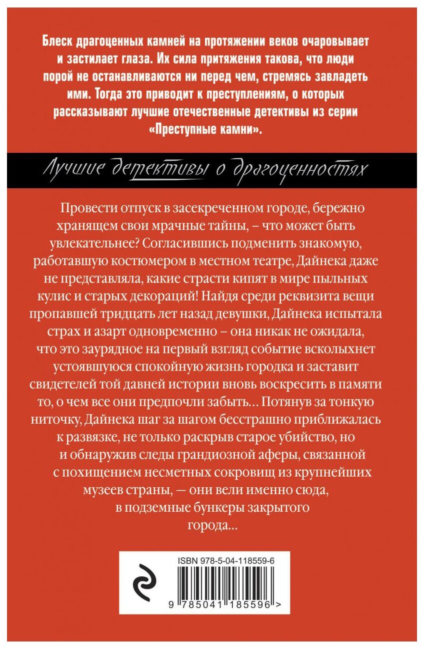 Провести отпуск в засекреченном городе, бережно хранящем свои мрачные тайны, — что может быть увлекательнее? Согласившись подменить знакомую, работавшую костюмером в местном театре, Дайнека даже не представляла, какие страсти кипят в мире пыльных кулис и старых декораций! Найдя среди реквизита вещи пропавшей тридцать лет назад девушки, Дайнека испытала страх и азарт одновременно — она никак не ожидала, что это заурядное на первый взгляд событие всколыхнет устоявшуюся спокойную жизнь городка и заставит свидетелей той давней истории вновь воскресить в памяти то, о чем все они предпочли забыть. Потянув за тонкую ниточку, Дайнека шаг за шагом бесстрашно приближалась к развязке, не только раскрыв старое убийство, но и обнаружив следы грандиозной аферы, связанной с похищением несметных сокровищ из крупнейших музеев страны — они вели именно сюда, в подземные бункеры закрытого города…