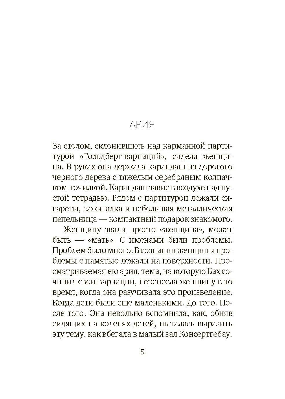 30 вариаций Баха родились из прекрасной арии. Которую мать и дочь считали «своей мелодией». Разучивая каждую вариацию, мать снова и снова вспоминает и проигрывает в памяти фрагменты своей жизни с дочерью. Свидетельства её взросления, её непосредственности и уникальности, красоты, отзывчивости, нежности. Женщина рассказывает о музыканте-супруге «отце», о сыне. Но главной героиней, безусловным протагонистом романа является дочь. Мы узнаём её в детстве и в отрочестве, в ранней юности - мы не перестаём удивляться насколько она прекрасна.