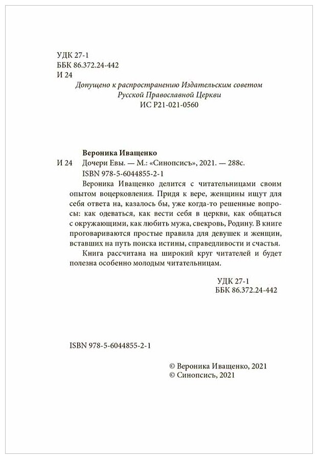 Книга замечательная! Спасибо Веронике Иващенко, за это благое дело! Написано просто и понятно, чем больше девушек прочитает, тем станет больше счастливых семей. Автор рассказывает свой путь к вере и отвечает на вопросы как девушкам и женщинам одеваться, как вести себя в церкви, как общаться с окружающими, как любить мужа, свекровь, Родину и т.д.
