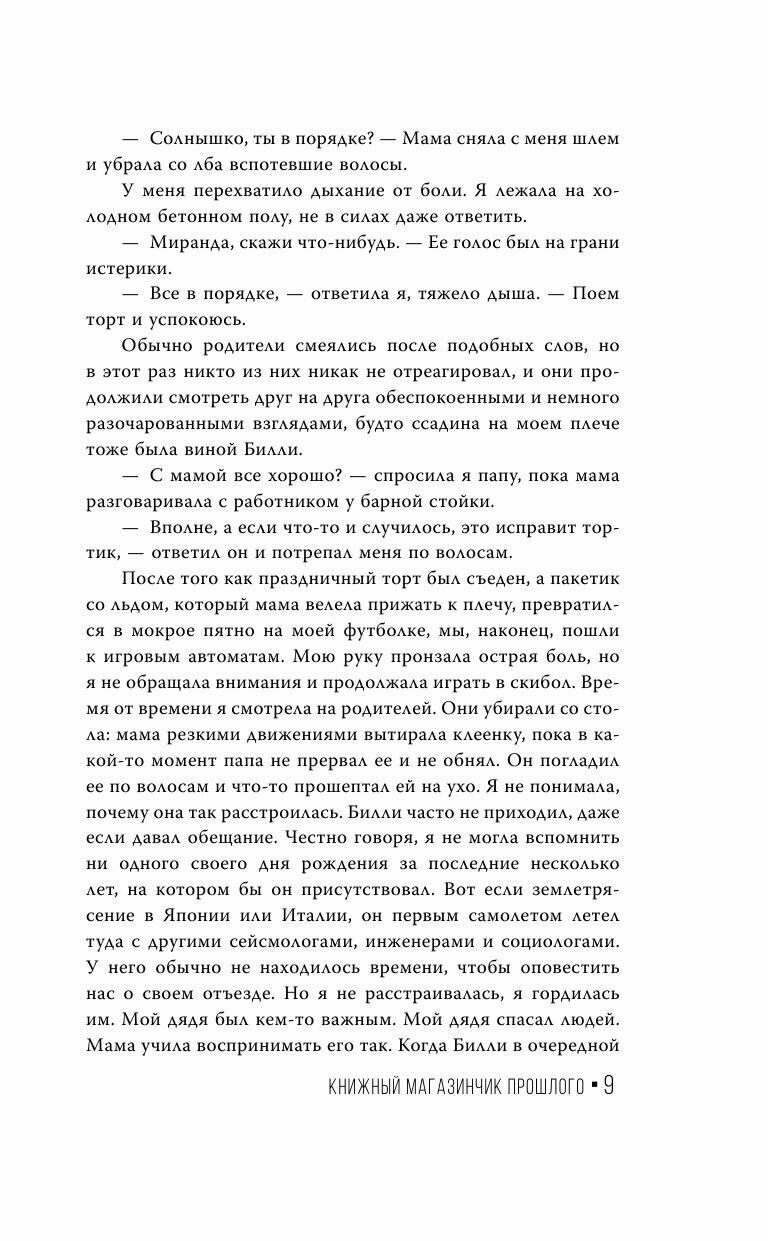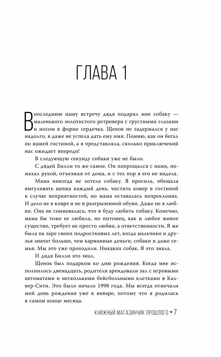 «Книжный магазинчик прошлого» — роман с большим сердцем и любовью к деталям. История о семье, чувствах и целительной силе людей, которые окружают каждого из нас. Это любовное письмо чтению и книжным магазинам, а также подтверждение того факта, что мы — это истории у нас за плечами.