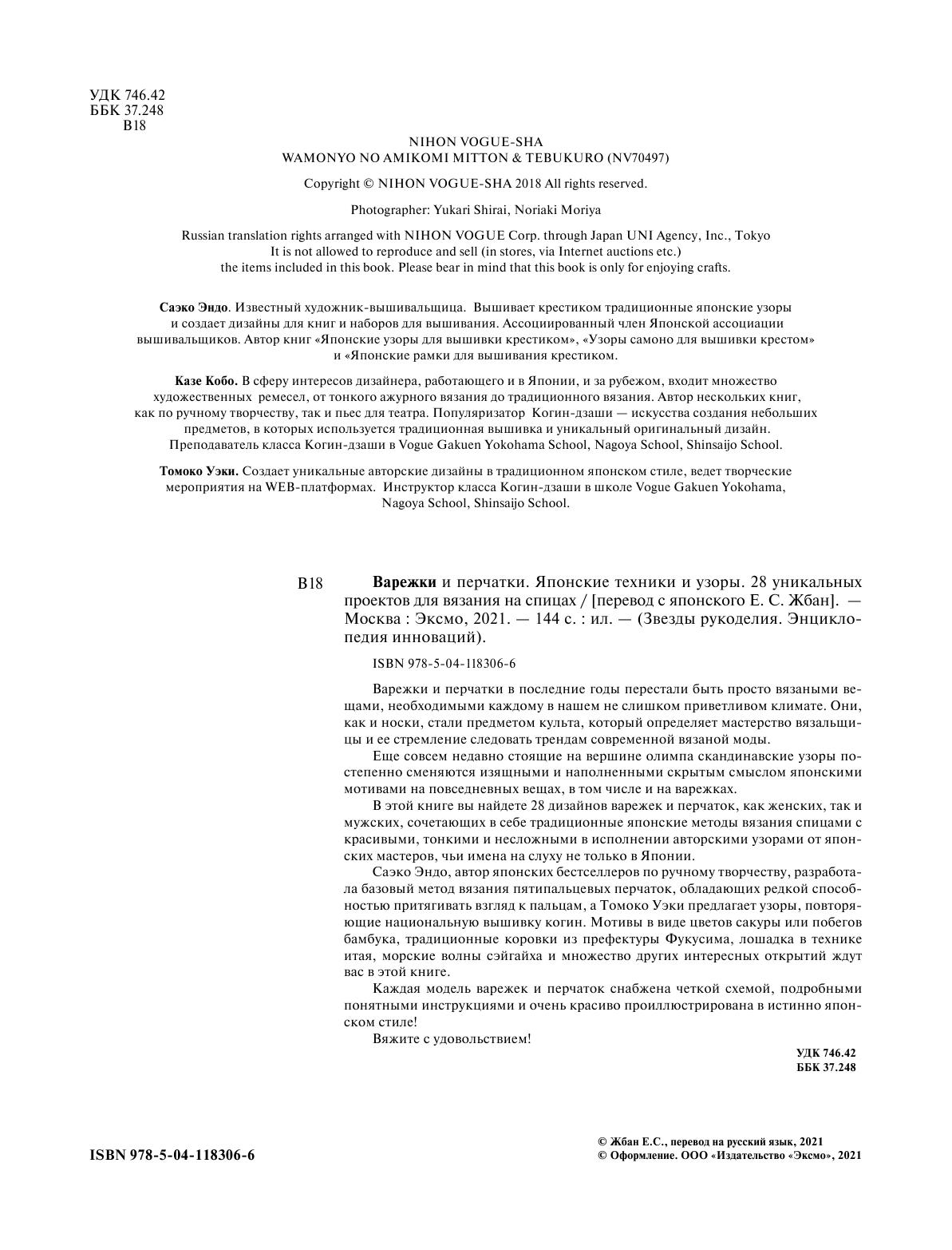 В этой книге вы найдете 28 дизайнов варежек и перчаток, как женских, так и мужских, сочетающих в себе традиционные японские методы вязания спицами с красивыми, тонкими и несложными в исполнении авторскими узорами от японских мастеров, чьи имена на слуху не только в Японии.