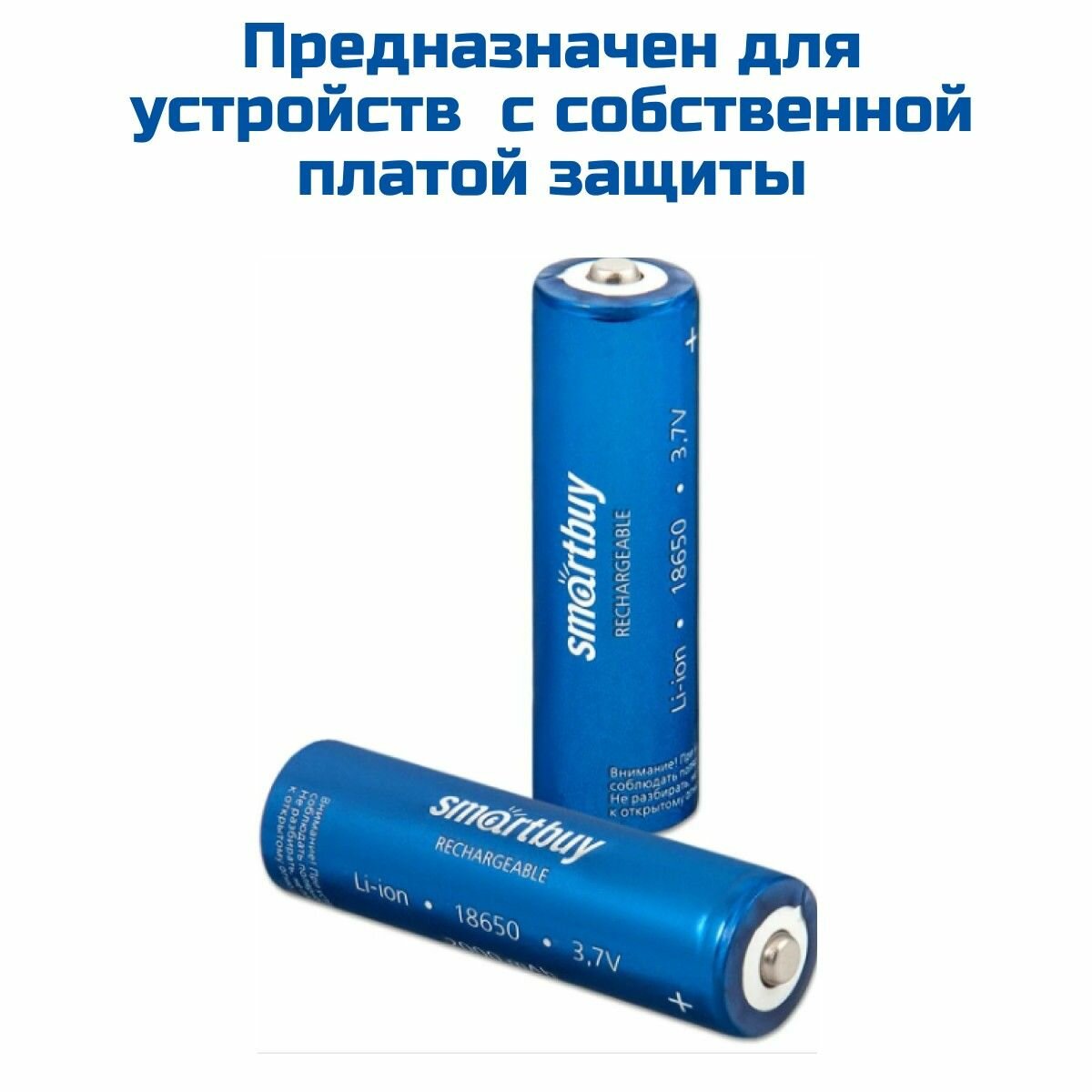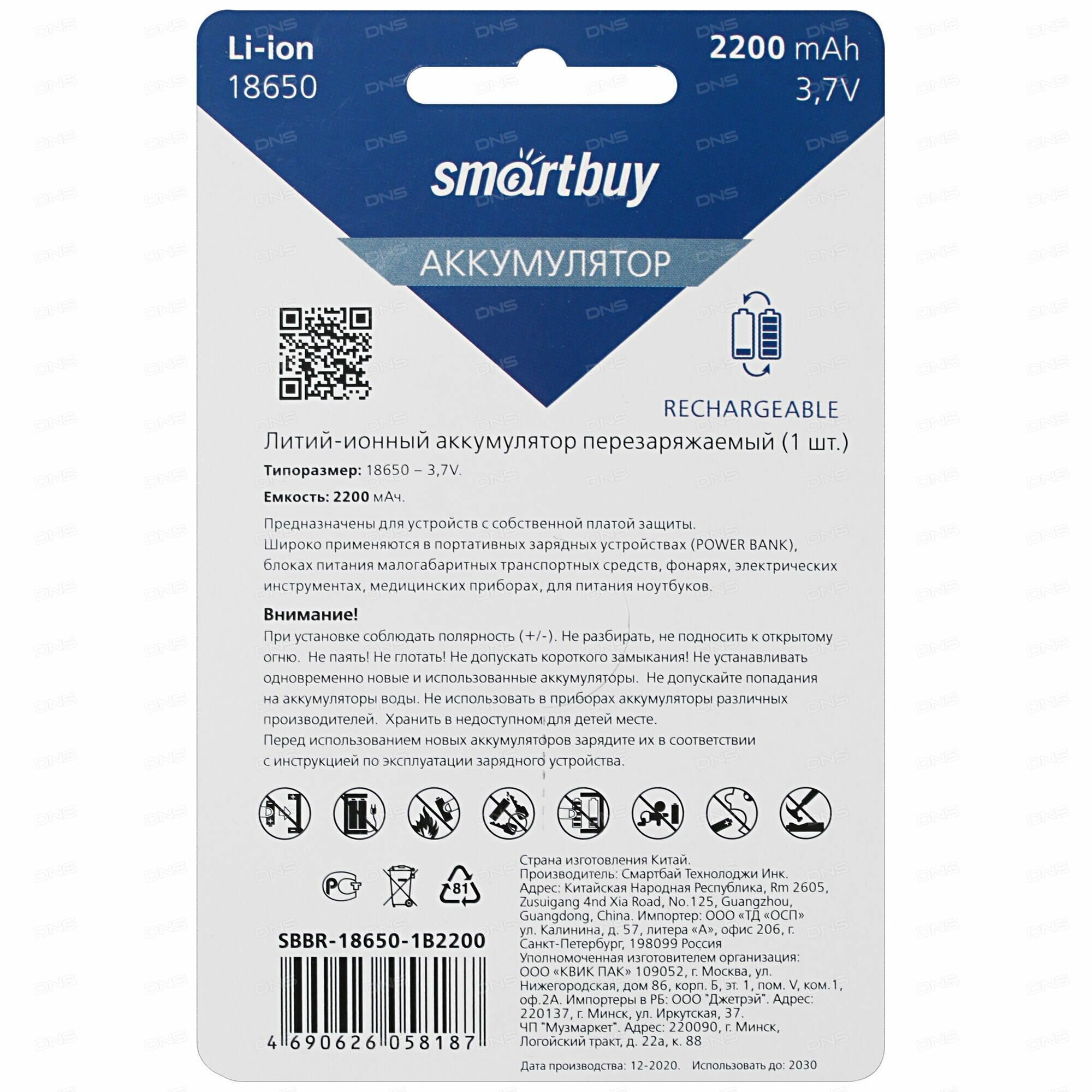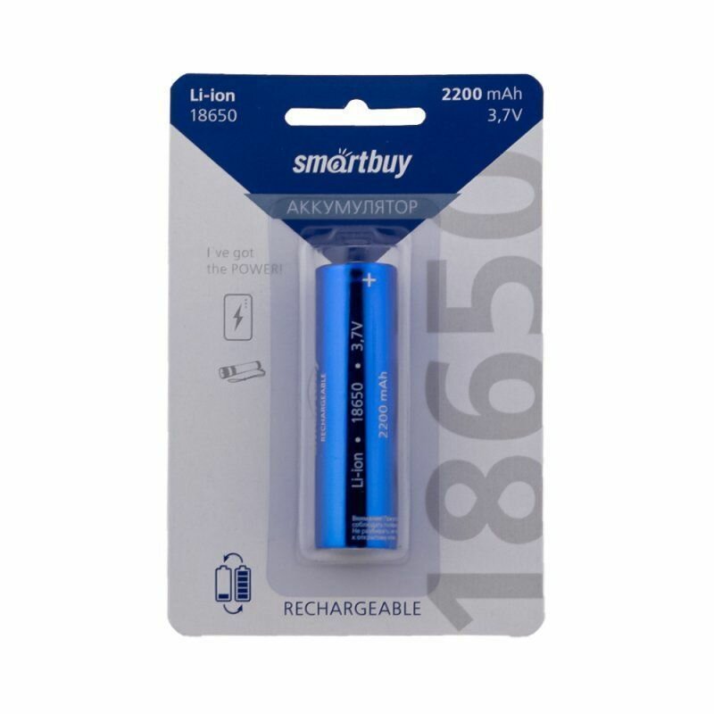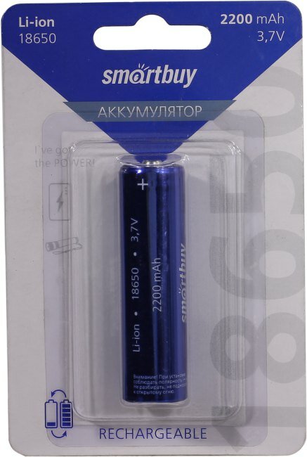 Аккумулятор (многоразовая заряжаемая батарея) 18650 SmartBuy 2200mAh Li-ion 3.7V, без защиты. Применяется в качестве автономного источника питания электронных, электрических и электромеханических устройств для которых требуется напряжение питания 3.7В.Аккумуляторы без защиты предназначены для использования в устройствах, имеющих собственную плату защиты от перезаряда и переразряда, таких как портативные аккумуляторные зарядки для смартфонов (Power Bank), блоки питания малогабаритных транспортных средств, электросамокатов, фонарики, электрические инструменты, медицинские приборы, питание ноутбуков и т. п.Аккумуляторы Li-ion SmartBuy имеют низкий саморазряд и практически не обладают эффектом памяти. Аккумулятор рассчитан на большое количество циклов перезаряда без потери емкости и потребительских качеств.Основные плюсы:· Простота в обслуживании.· Малый удельный вес.· Низкий уровень саморазряда.· Высокая энергетическая плотность.· Аккумулятор 18650 не имеет эффекта памяти.· Срок службы от 7-10 лет.· Основные сферы применения:· Фонари· Отдельные виды электроинструментов· Портативные зарядные устройства и т. д