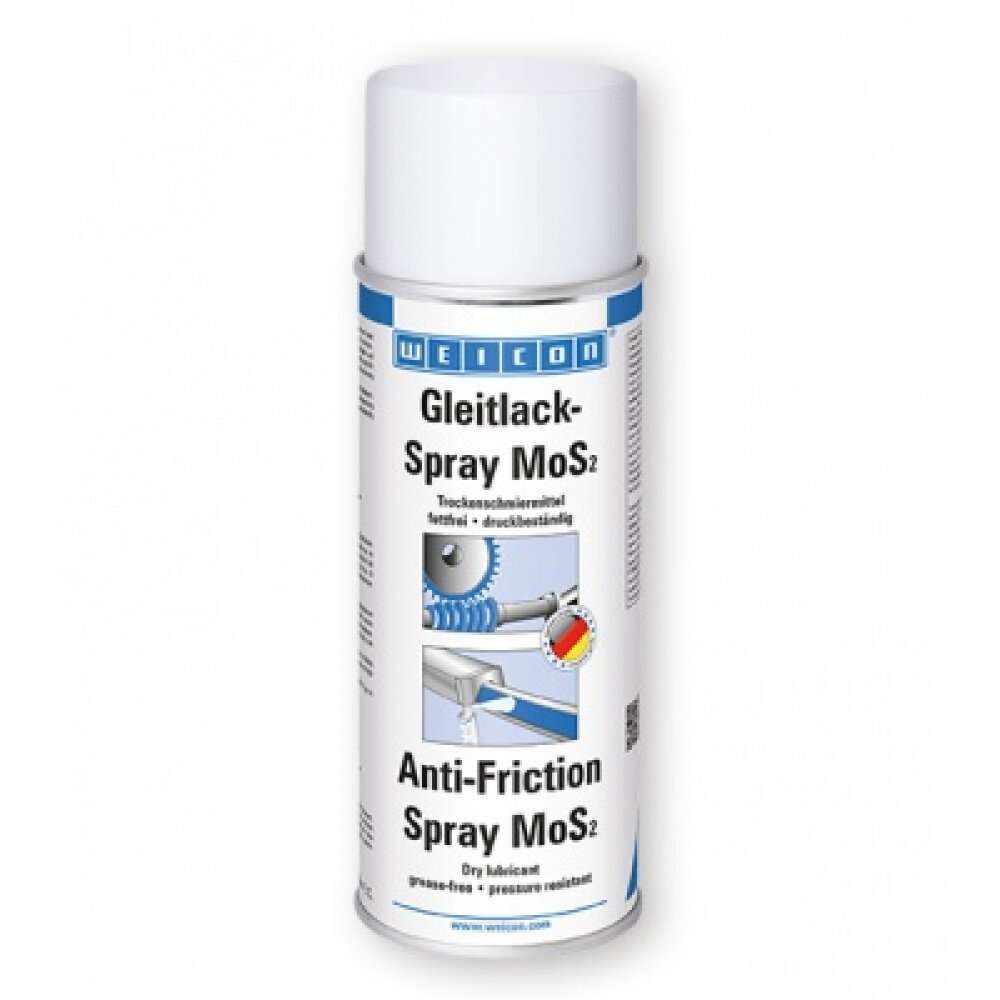 Средство для сухой смазки.WEICON Антифрикционный спрей с молибденом представляет собой, не содержащее жиры, средство для сухой смазки с высокой устойчивостью к воздействию давления и температуры от -200 °C (-328 °F) до +450 °C (+842 °F). Покрытие отталкивает грязь, пыль и воду, устойчиво к воздействию масел, смазок и химикатов и прочно держится на металлических, пластмассовых и деревянных поверхностях. Высокое содержание MoS2 обеспечивает смазку при скольжении, снижает трение, служит в качестве твердого смазывающего материала и гасит рабочие шумы.Антифрикционный спрей с молибденом сокращает время и улучшает условия запуска подшипников скольжения, зубчатых соединений и других пар скольжения, особенно при высоких нагрузках давлением и низкой скорости скольжения. WEICON Антифрикционный спрей с молибденом можно использовать на направляющих скольжения, на ходовых рельсах и направляющих, на ленточных конвейерах, лентопротяжных роликах и транспортировочных лотках, в качестве покрытия на штампах, на погрузочном оборудовании, вместо разделительного средства, содержащего силикон, а также везде, где смазка маслом или консистентной смазкой недопустима или нежелательна.
