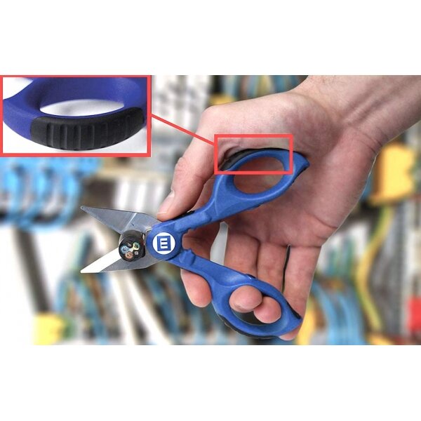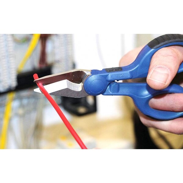 Универсальные ножницы монтажника для резки провода/кабеля и снятия изоляции. Предназначены для резки монтажных проводов, кабелей типа ВВГ, NYM, ПВС диаметром по оболочке до 13 мм и для снятия оболочки круглых кабелей.- Двухкомпонентные пластиковые рукоятки позволяют удобно держать инструмент в руке- Высококачественное лезвие из специальной нержавеющей стали